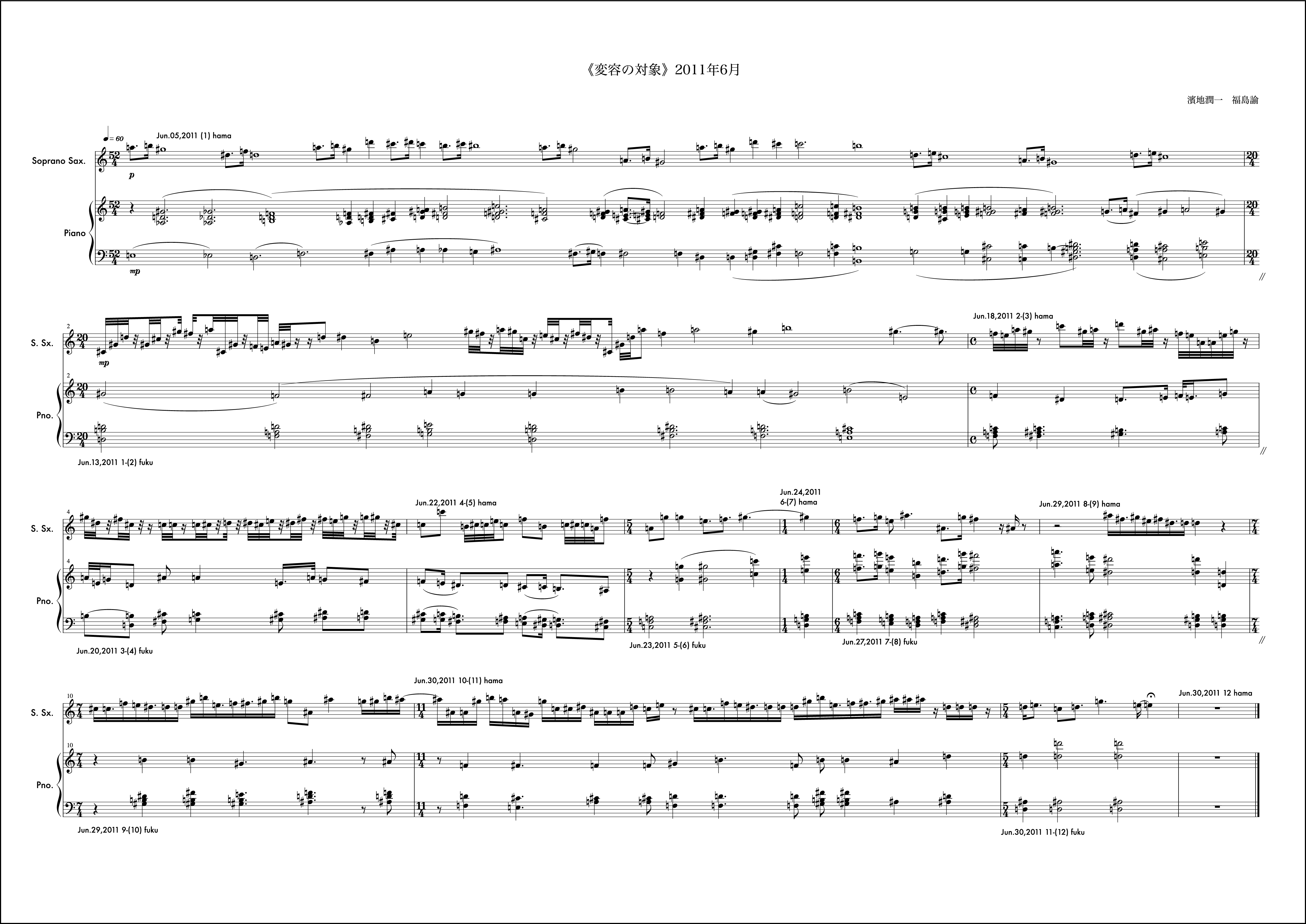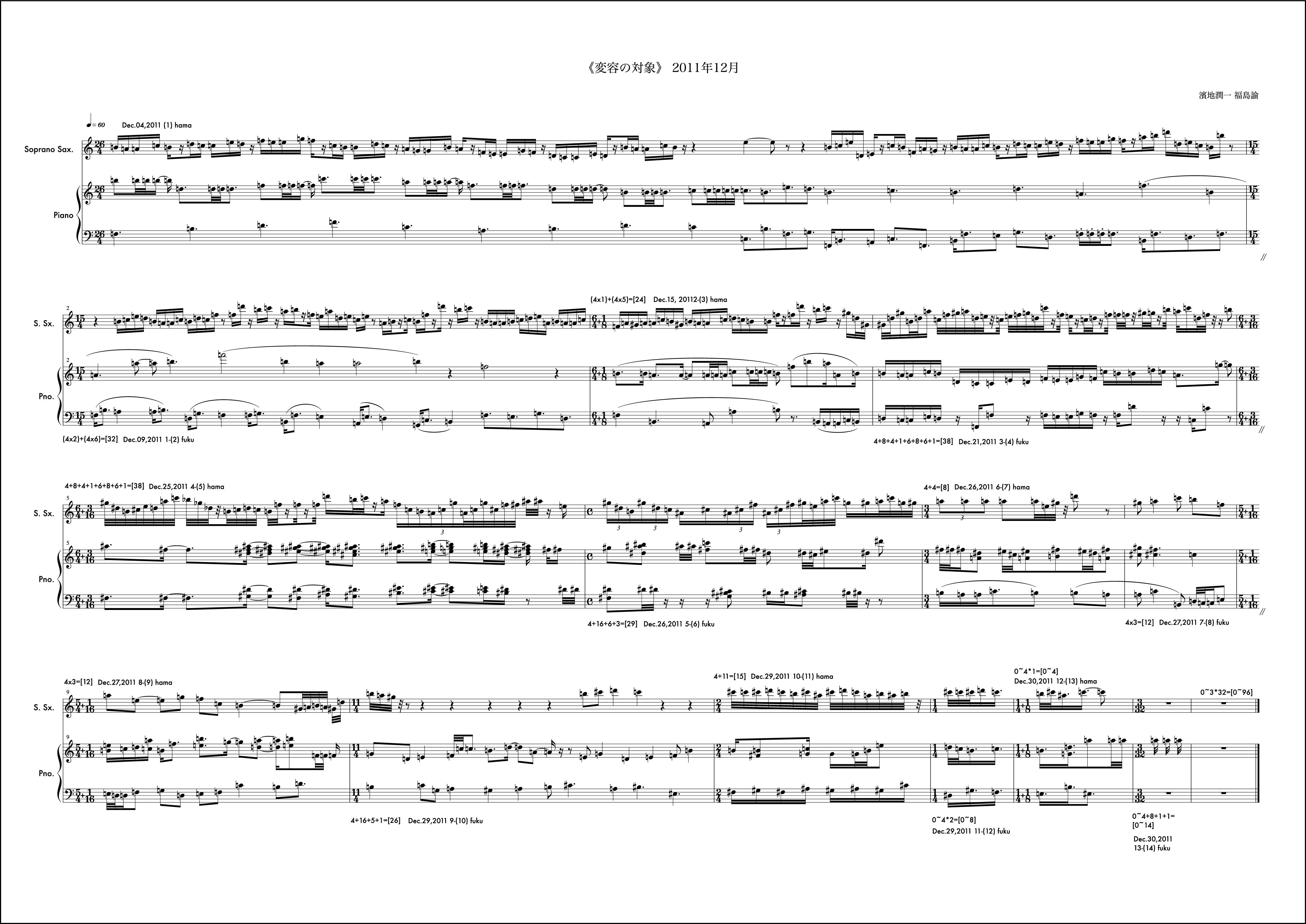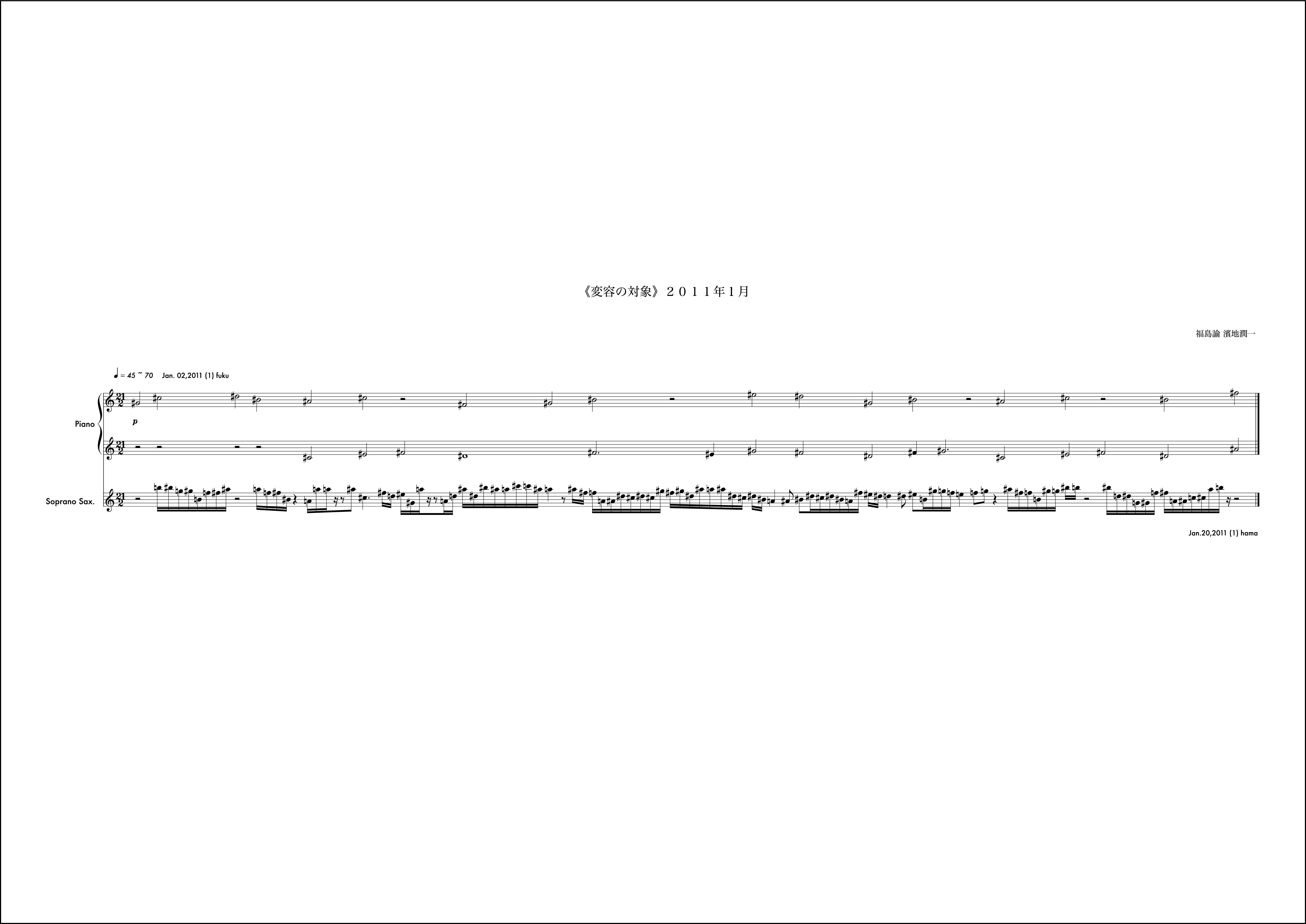 12月はとても印象に残る作品になった。2011年をこれも象徴する作品。動機は僕からで、モチーフを組織するにあたって概念をしのばせている。hamaji junichiと僕の名前を表記する。その中で音の名前に使われている語を取り出すと順にhaachとなる。hはシの音。aはラの音。cはドの音。このhaachという音の並びをモチーフに動機を書き始めています。これがしのばせた概念。(こういった手法はバッハにも見られることを付記しておく)その音のモチーフのヴァリエーションで1小節目を形成しています。それを受け、福島さんも自身の名前を使い1小節目のピアノの組織を構成し応えています。予めこのしのばせた概念は福島さんと共有することが必要と思い、お知らせしました。「変容の対象」では時としてはそういったことが邪魔になるので互いに組織に関する説明をすることは基本的にしません。ですがこれは例外的に必要だと感じたので共有しました。2小節目以降から徐々に曲の楽想が大きくなっていきました。月の半ばあたりから「これは今月で終わるかな、、、」という危惧が微かに頭にのぼり、後半につれてますますその思いは強くなりました。告白すると10小節目から11小節目にかけて僕はその大きな楽想の流れを分断しなければならなかった。それが純粋にこの楽曲の欲する行為だったかは今となっては神のみぞ知るようなものですが「変容の対象」がひと月で曲を終わらせる(未完という可能性も含めて)思想をもっている以上僕はそうする決断を迷いながら為した。その結果11小節目は個人的には愛着のあるものになったけれど、流れから言えばそれはちょっとクレイジーな組織でもあり、そのままもし、時間が2ヶ月か、3ヶ月あれば、「ああはしなかっただろう」ということも含めて強い印象を残しています。つまりそれは「変容の対象」という作品が3年目を経験し得たことによってより大きな楽想をもつ条件が揃ってきたことに他ならず、4年目はどんなことが起こるのかある示唆を含んだような気配すらします。