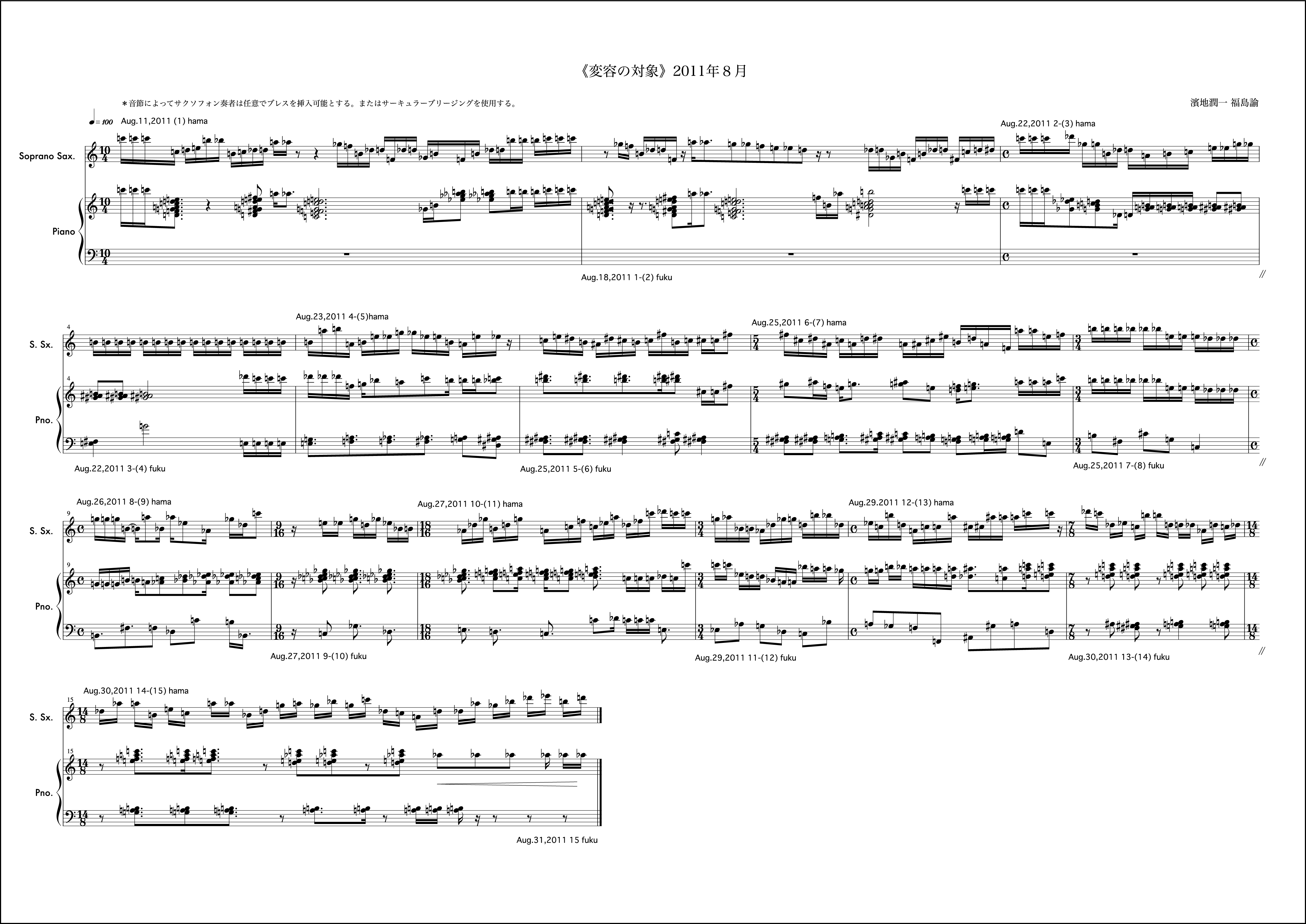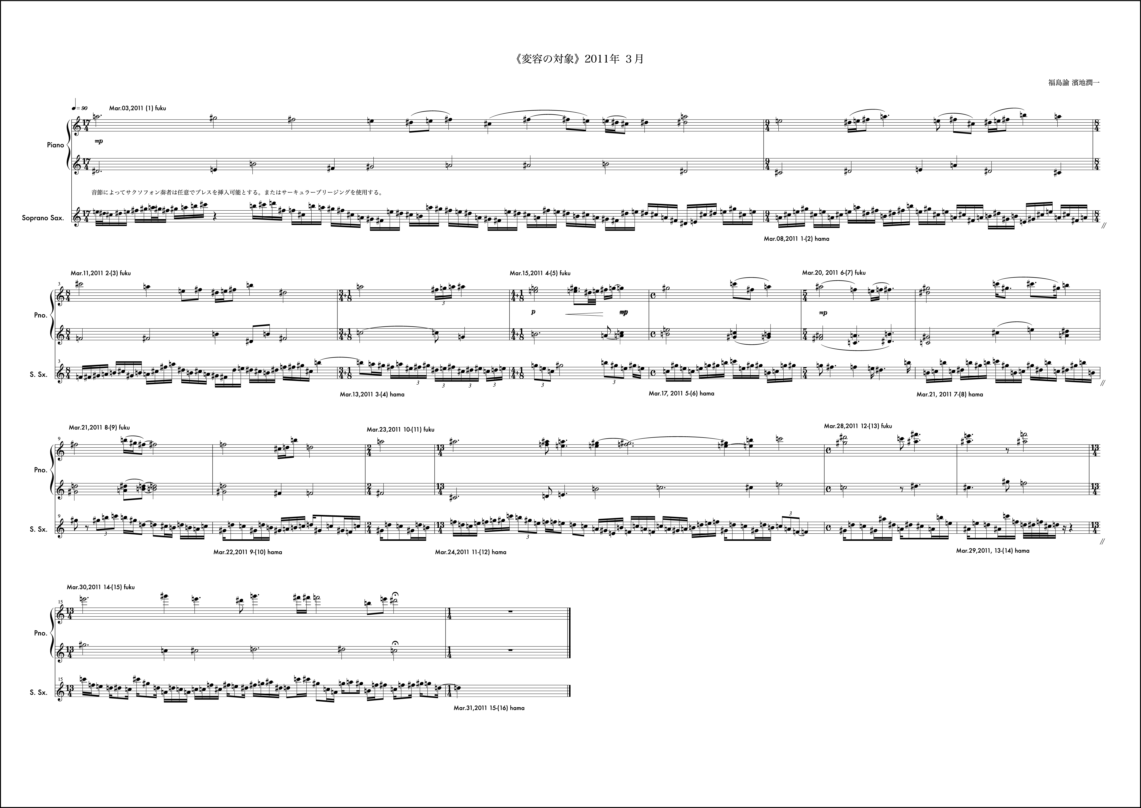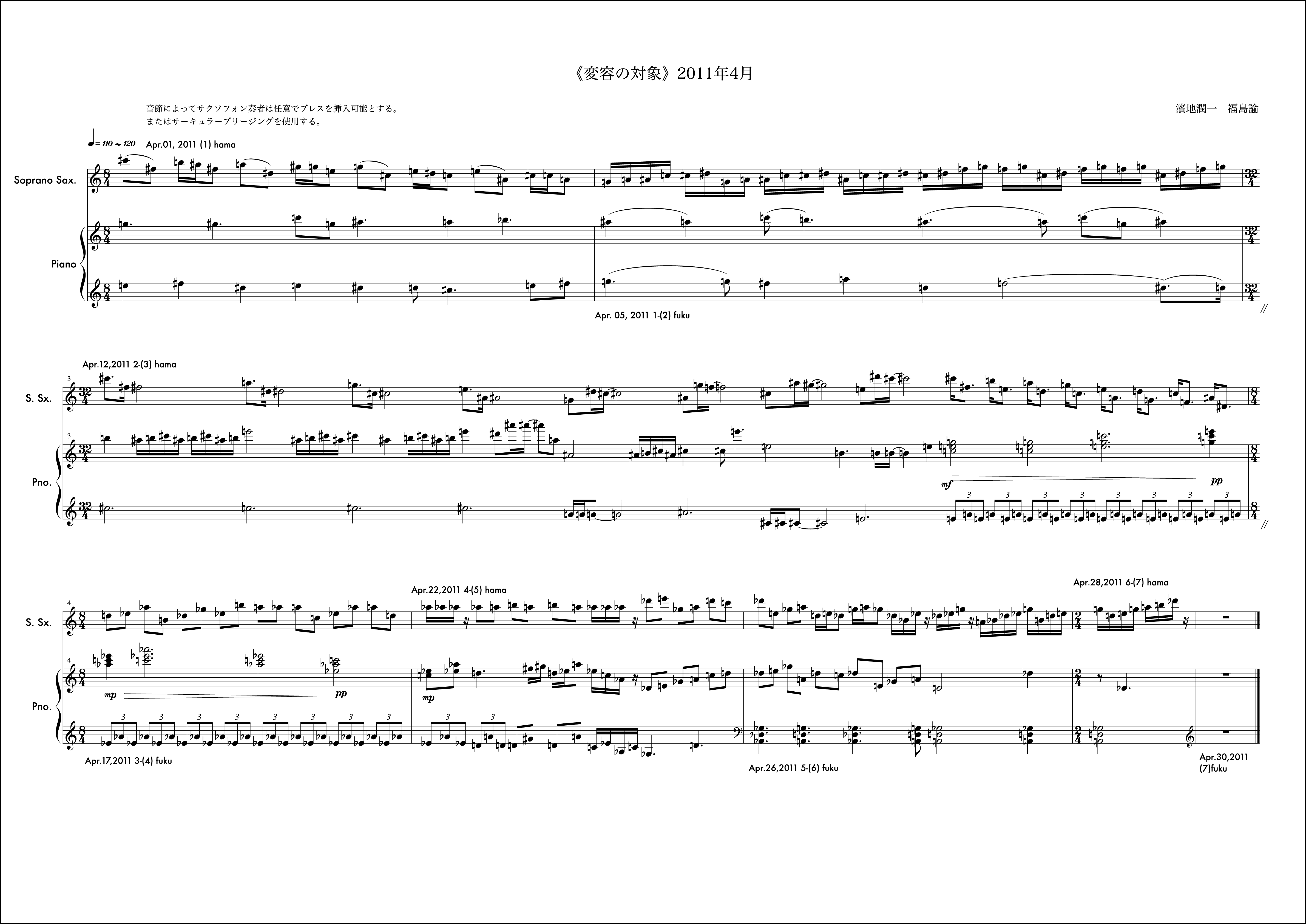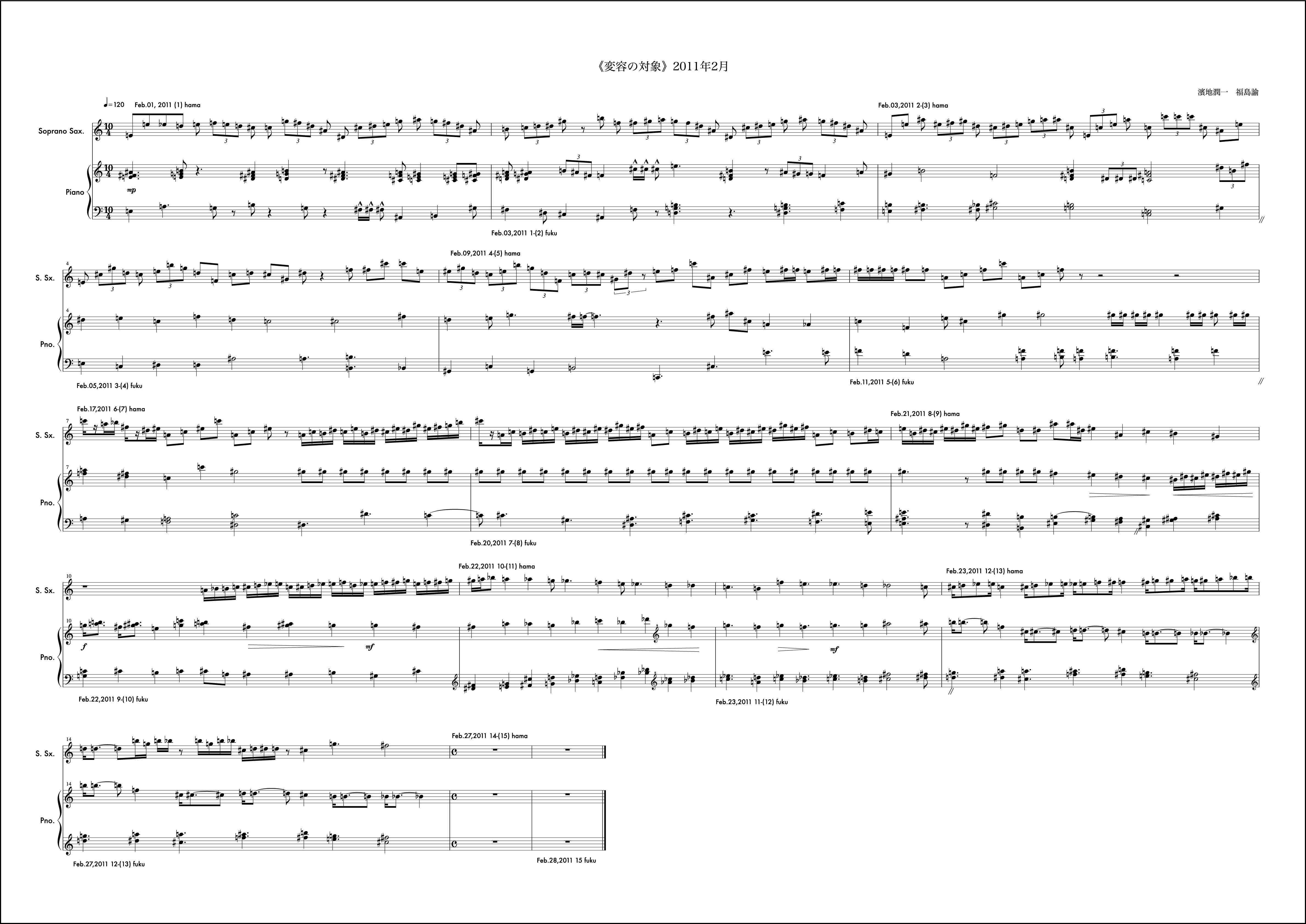 12月はとても印象に残る作品になった。2011年をこれも象徴する作品。動機は僕からで、モチーフを組織するにあたって概念をしのばせている。hamaji junichiと僕の名前を表記する。その中で音の名前に使われている語を取り出すと順にhaachとなる。hはシの音。aはラの音。cはドの音。このhaachという音の並びをモチーフに動機を書き始めています。これがしのばせた概念。(こういった手法はバッハにも見られることを付記しておく)その音のモチーフのヴァリエーションで1小節目を形成しています。それを受け、福島さんも自身の名前を使い1小節目のピアノの組織を構成し応えています。予めこのしのばせた概念は福島さんと共有することが必要と思い、お知らせしました。「変容の対象」では時としてはそういったことが邪魔になるので互いに組織に関する説明をすることは基本的にしません。ですがこれは例外的に必要だと感じたので共有しました。2小節目以降から徐々に曲の楽想が大きくなっていきました。月の半ばあたりから「これは今月で終わるかな、、、」という危惧が微かに頭にのぼり、後半につれてますますその思いは強くなりました。告白すると10小節目から11小節目にかけて僕はその大きな楽想の流れを分断しなければならなかった。それが純粋にこの楽曲の欲する行為だったかは今となっては神のみぞ知るようなものですが「変容の対象」がひと月で曲を終わらせる(未完という可能性も含めて)思想をもっている以上僕はそうする決断を迷いながら為した。その結果11小節目は個人的には愛着のあるものになったけれど、流れから言えばそれはちょっとクレイジーな組織でもあり、そのままもし、時間が2ヶ月か、3ヶ月あれば、「ああはしなかっただろう」ということも含めて強い印象を残しています。つまりそれは「変容の対象」という作品が3年目を経験し得たことによってより大きな楽想をもつ条件が揃ってきたことに他ならず、4年目はどんなことが起こるのかある示唆を含んだような気配すらします。