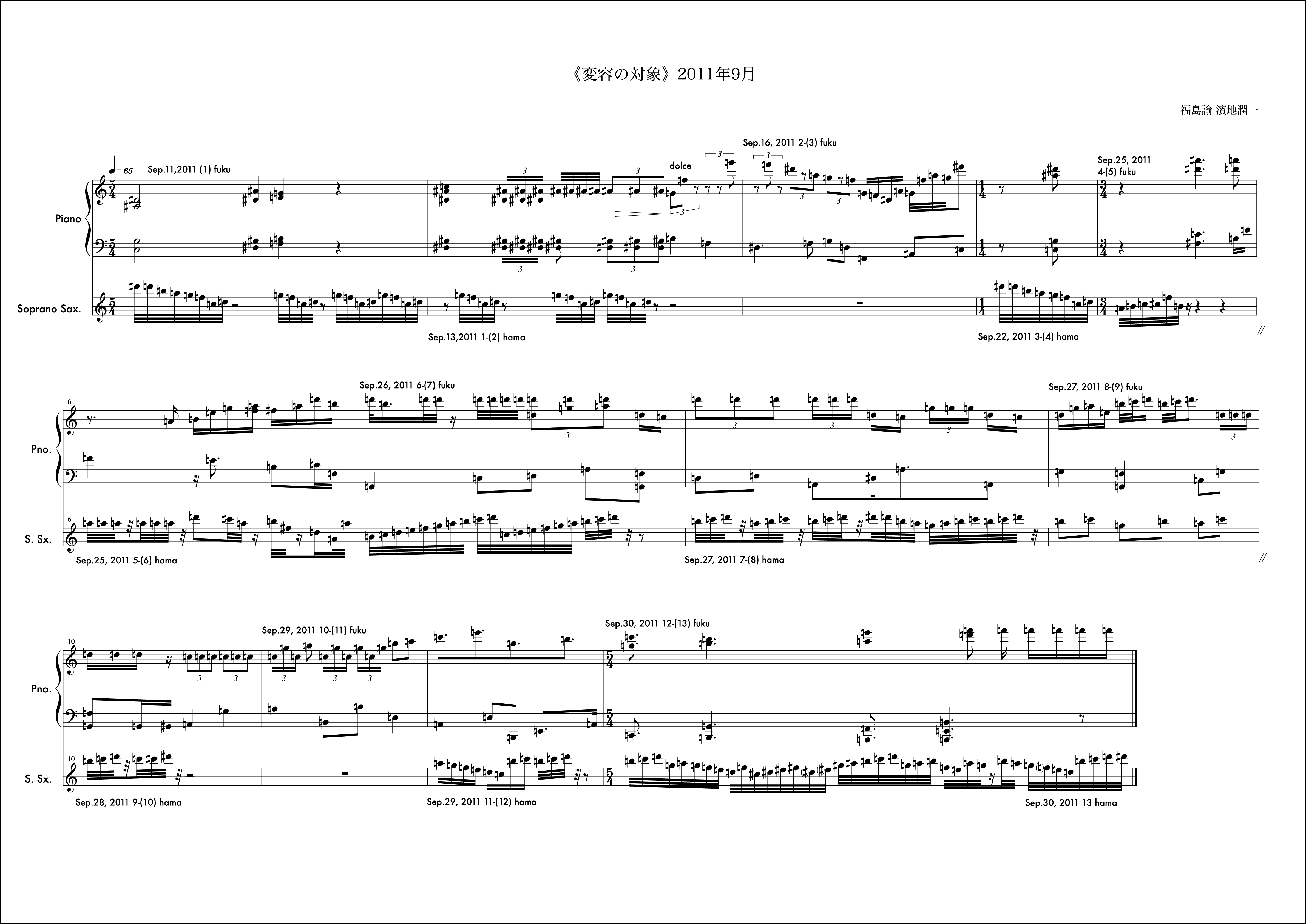 結局これは、《変容の対象》の作曲方法における語法の一端が確立(少なくとも濱地、福島の間に両者なりの理解が生まれていた)されてきた中で、3年目が開始されたことと無関係ではないだろう。当初はあらゆることが未整理だったが相互作曲というやり取りの中で「自ら決定を迫られる領域」というものが少なからず存在することは意識されてきていた。その領域をお互い認識しつつ、丁寧に裏切り(時には従い)ながら新たな領域を目指すことができてきており、それは全く明確な作業ととなりつつあった。この態度は、2009年当初、不確定な部分に飲み込まれるような感覚で作曲に向っていた態度とは明らかに異なっていたように思う。