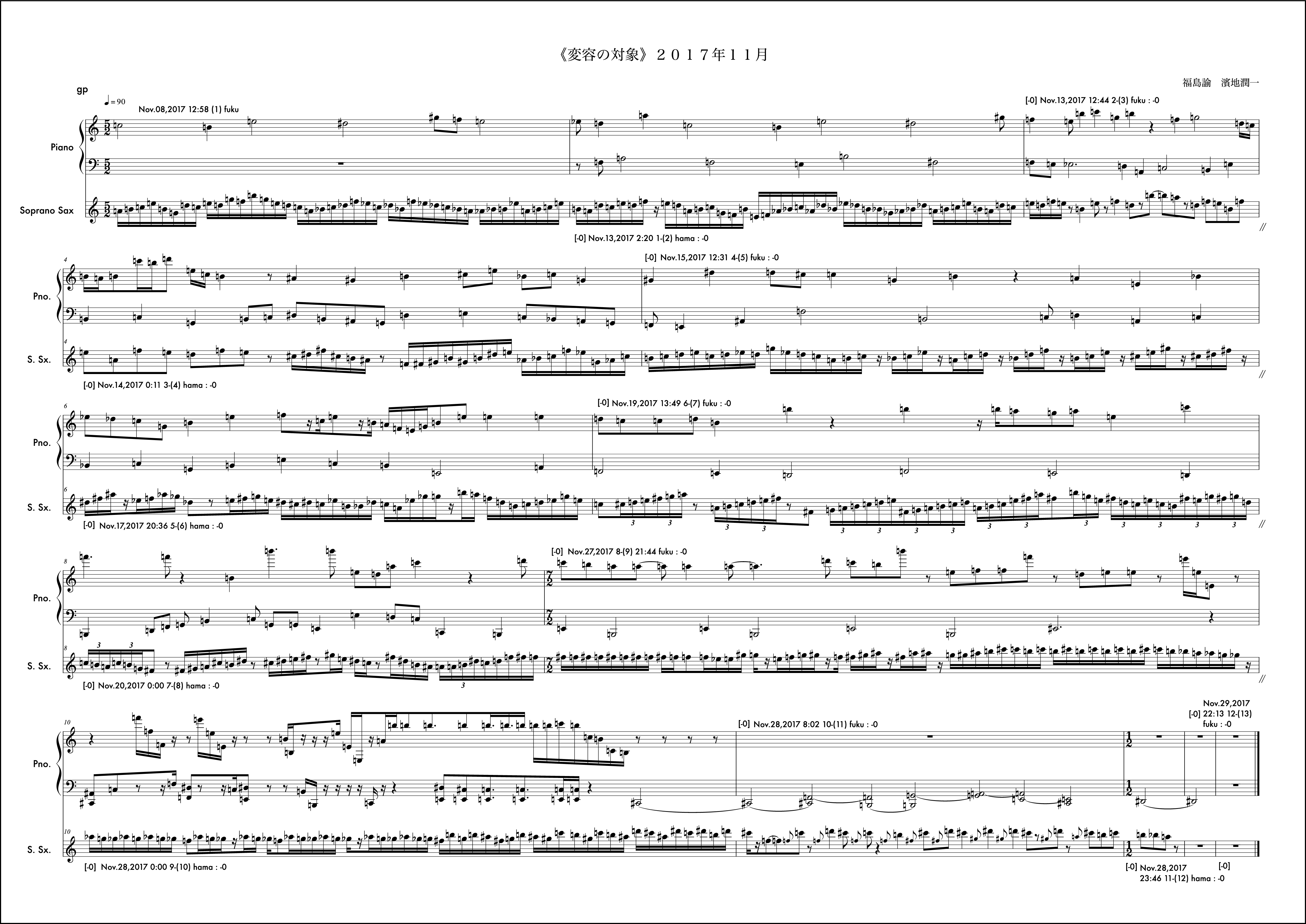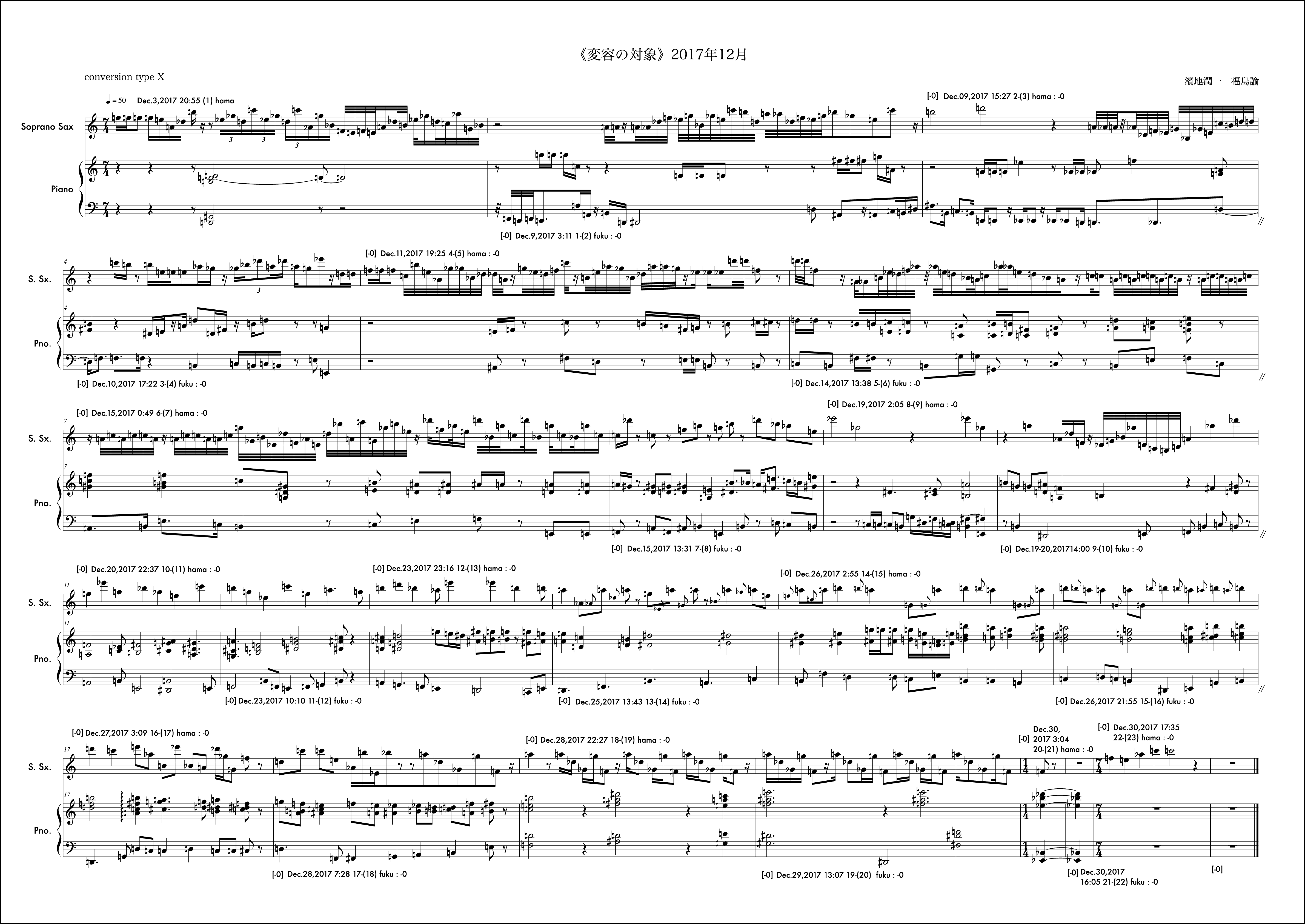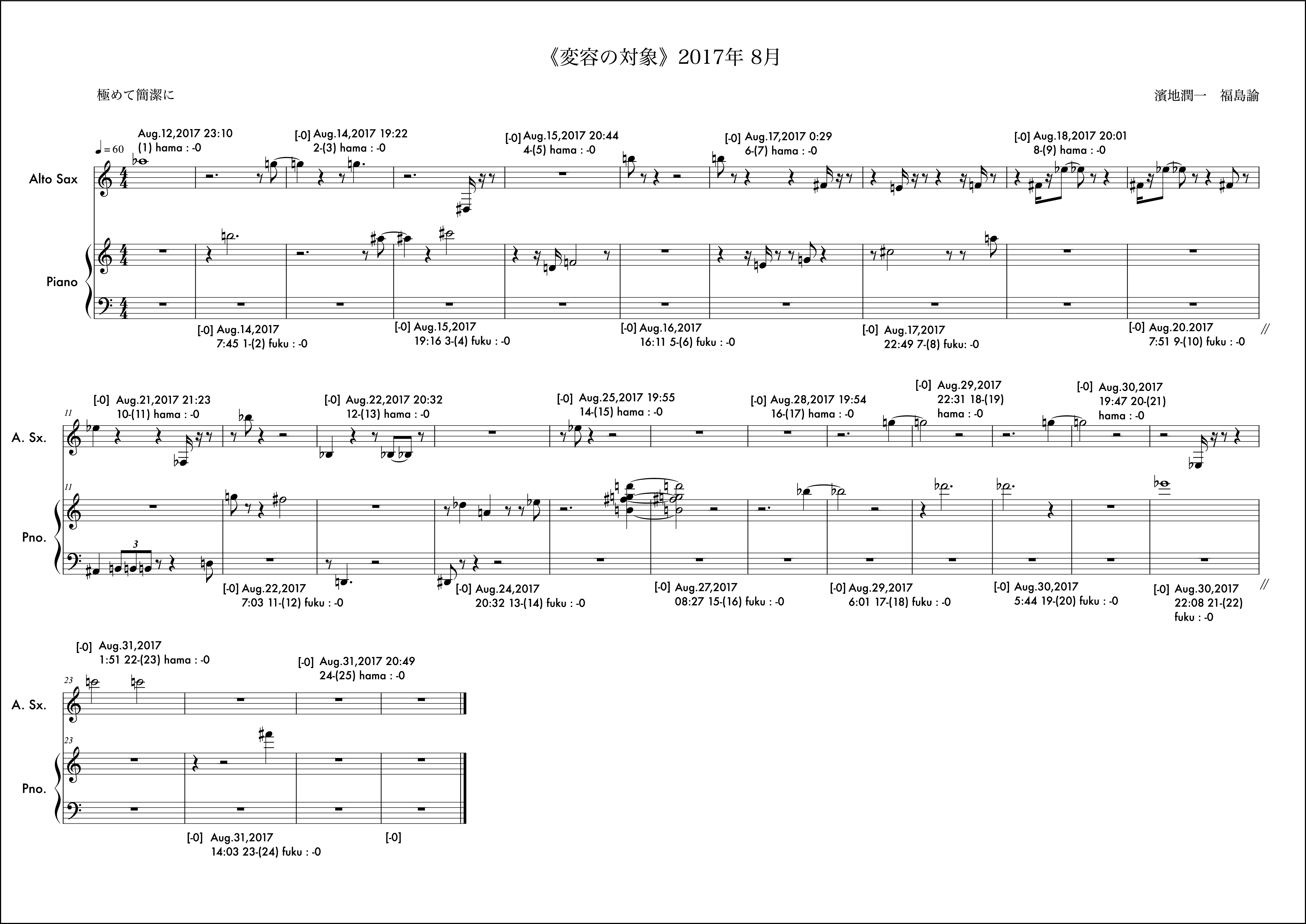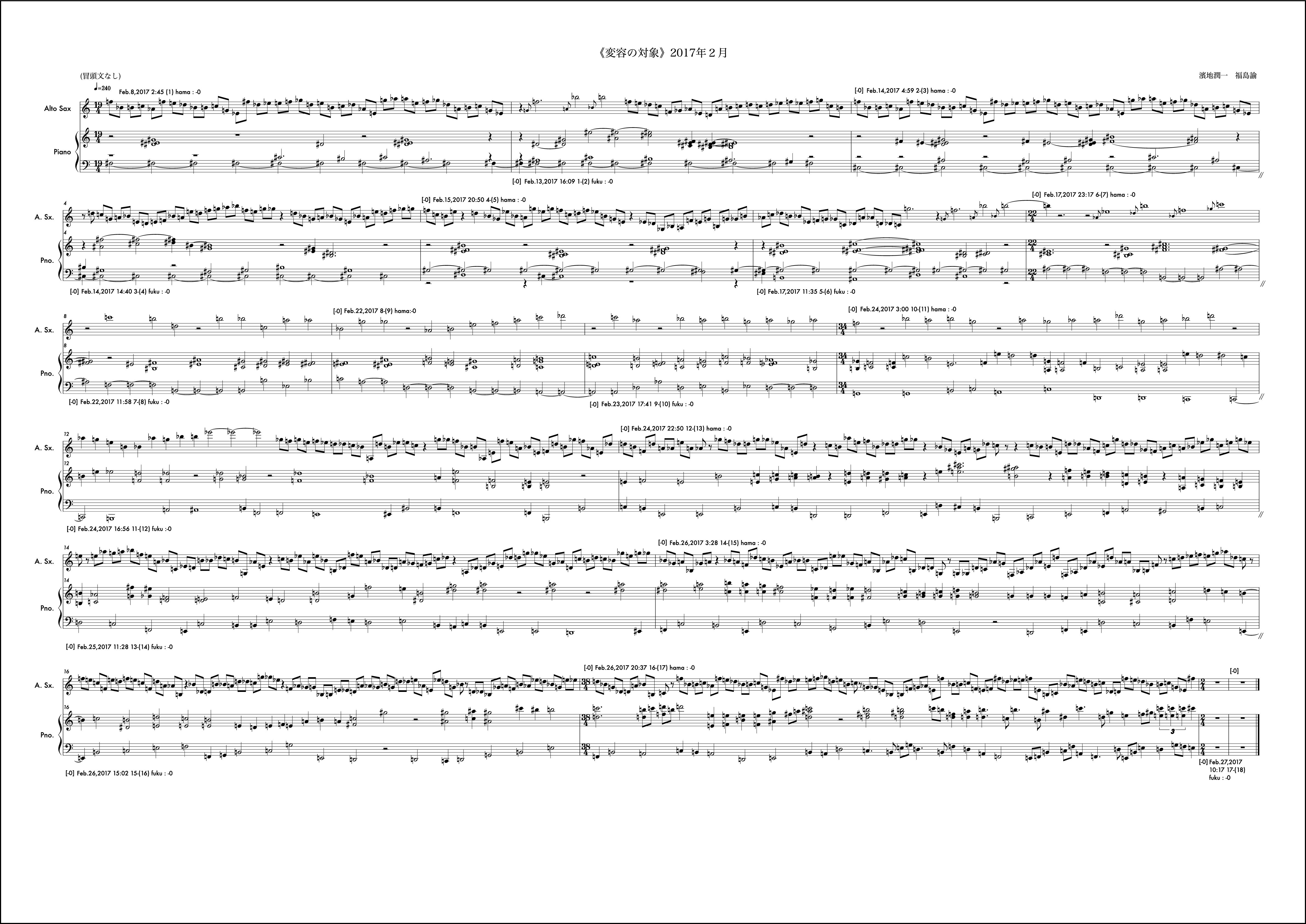 2017年12月31日の21時に濱地潤一さんからのメール連絡を受けて、2017年版《変容の対象》も無事に12曲の作曲を終えることができた。これで9年分の《変容の対象》が完成された。《変容の対象》は、1年で12曲が作曲されるので、ここまでで(9年×12曲=)108曲の共作が生み出されたことになる。濱地潤一と福島諭の五線譜を介した作曲(交換作曲形式)を行ってきた《変容の対象》は、9年目を終えて「楽想のあり方」自体には落ち着いたものを感じている。現在《変容の対象》で表現し得る領域は、おおよその許容範囲が見えている状態にはあり、そこには嘗て作品としての純度が高く残った領域もあれば、この形式では上手く留まらない領域もある、その辺りの判断は大分整理されてきているように感じている。そんな中にあって、かつてのように未だ知らない領域を求めるようにヒリヒリとした感覚を持ちながら作曲するというようなことは少なくなっているとは思う一方で、各月で提示される第一動機からどのように楽想が形作られていくかの興味は未だ尽きることはなかった、というのが2017年版を作曲していて感じられた基本姿勢だったと思う。