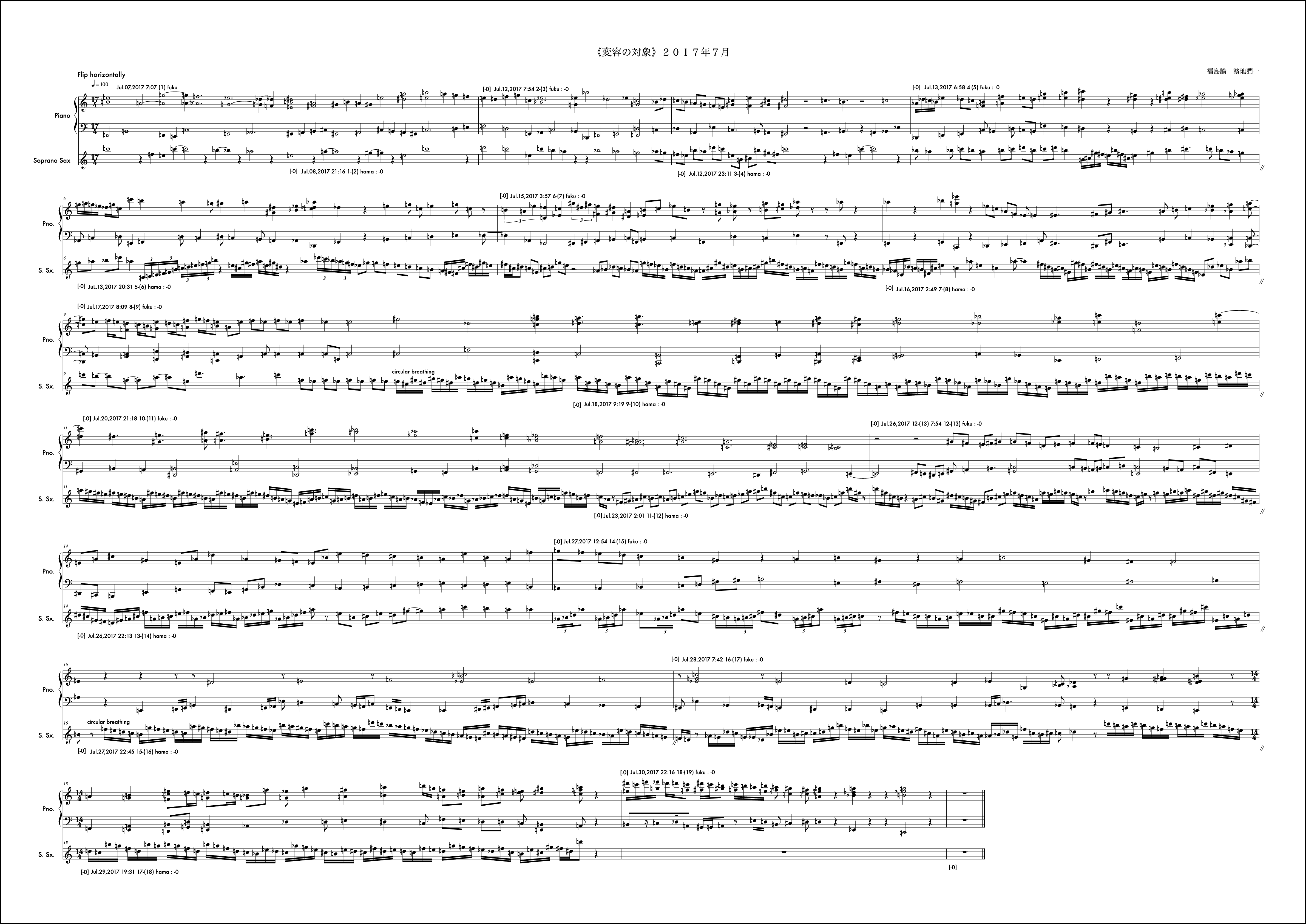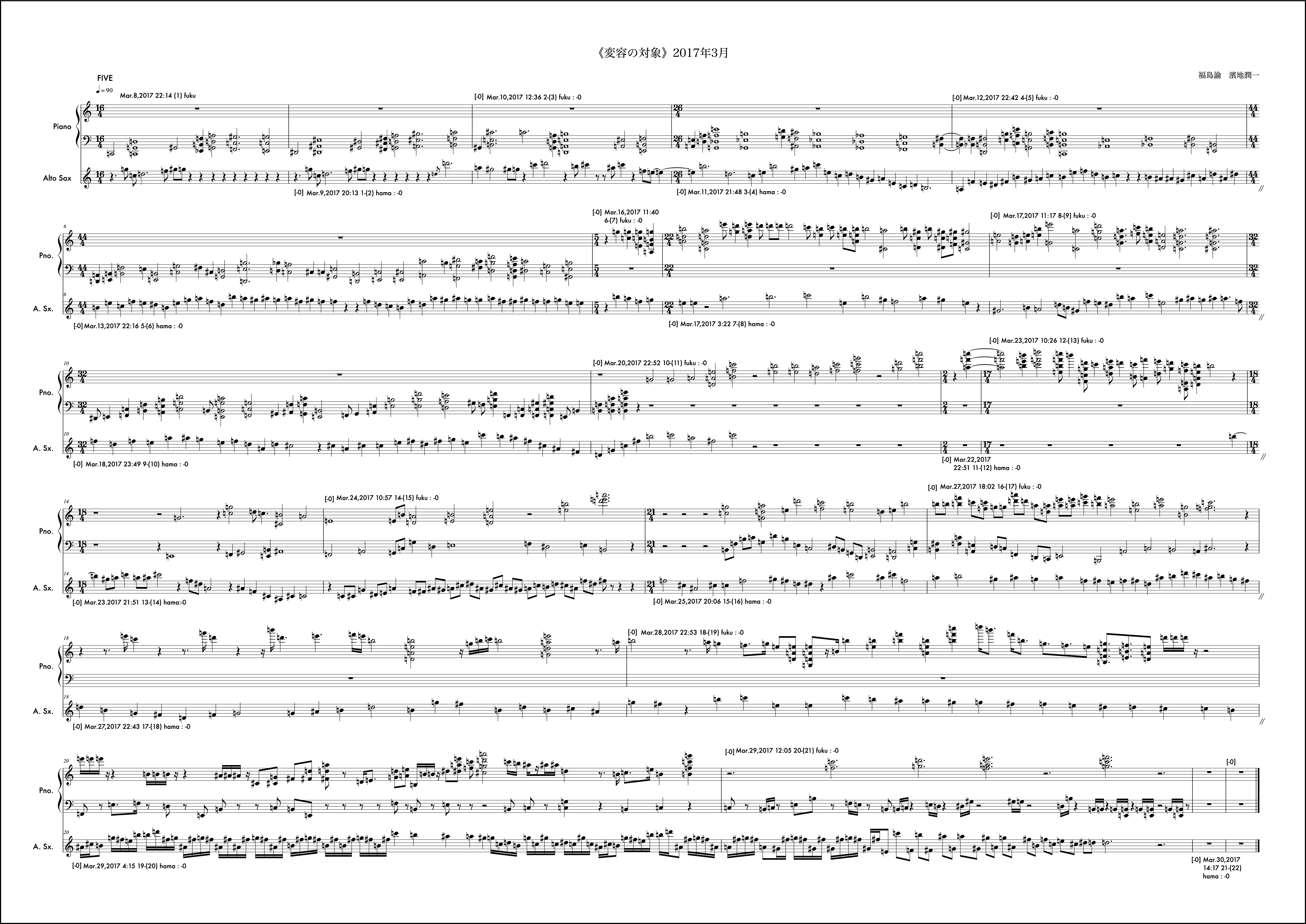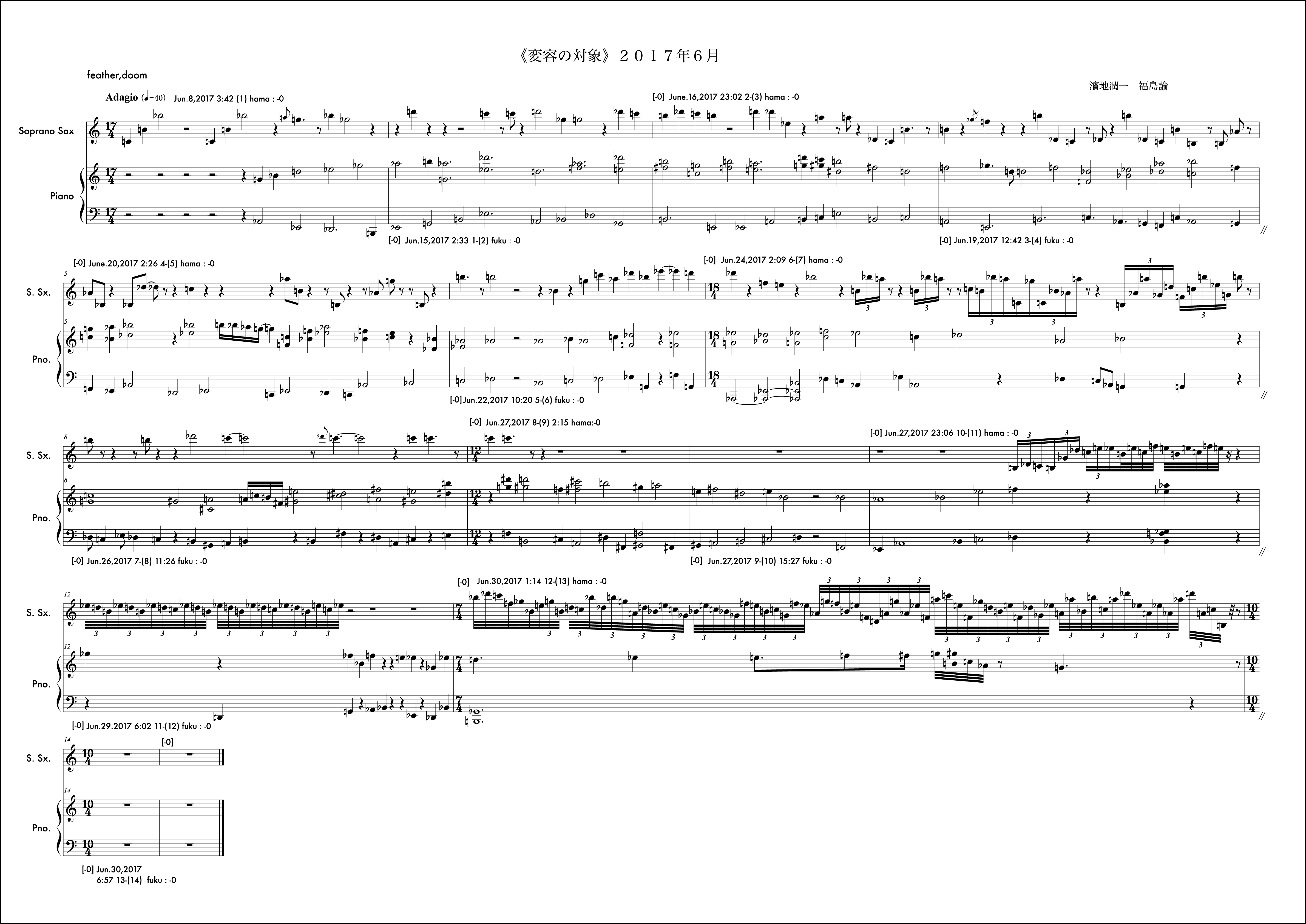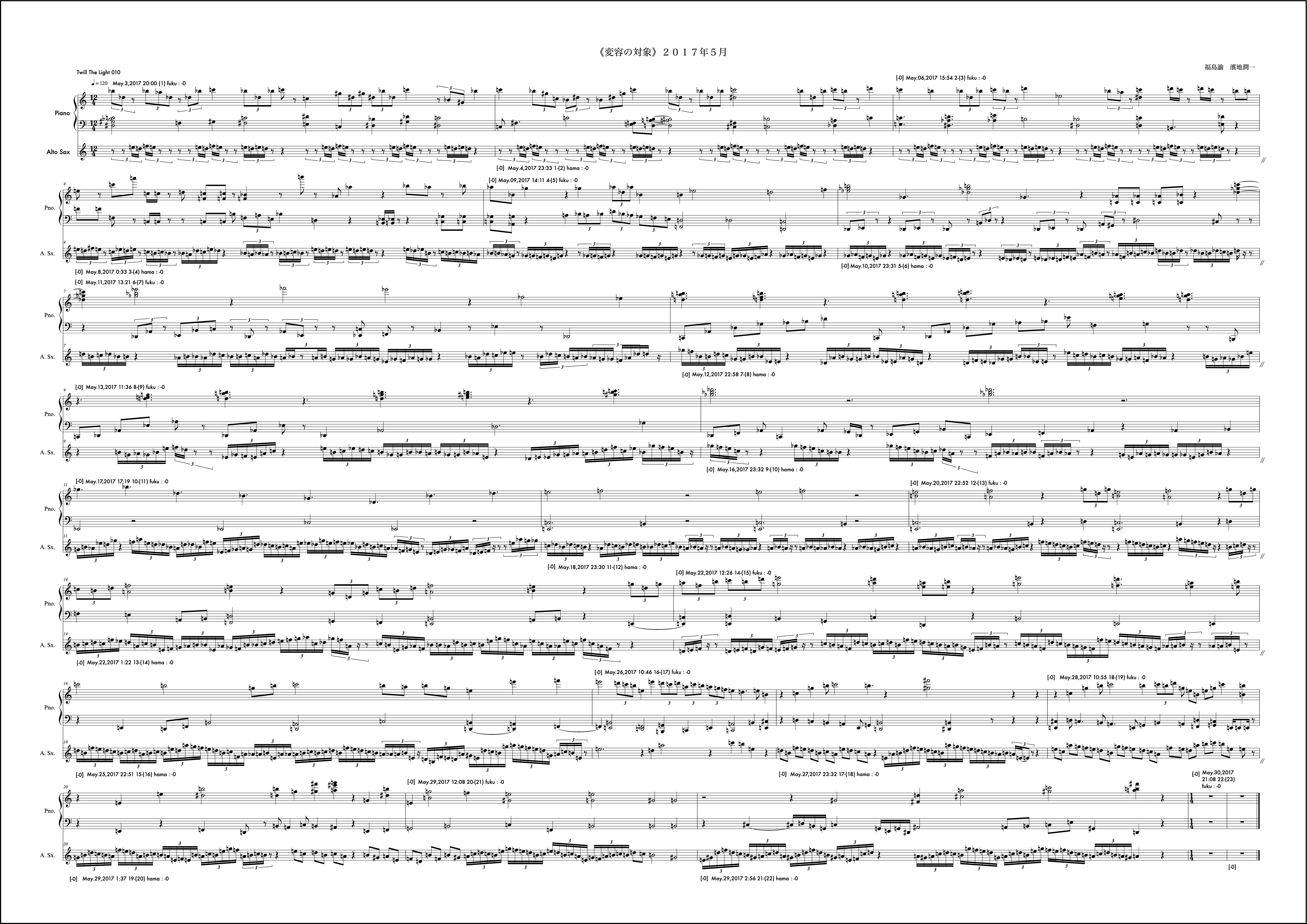 2017年12月31日の21時に濱地潤一さんからのメール連絡を受けて、2017年版《変容の対象》も無事に12曲の作曲を終えることができた。これで9年分の《変容の対象》が完成された。《変容の対象》は、1年で12曲が作曲されるので、ここまでで(9年×12曲=)108曲の共作が生み出されたことになる。濱地潤一と福島諭の五線譜を介した作曲(交換作曲形式)を行ってきた《変容の対象》は、9年目を終えて「楽想のあり方」自体には落ち着いたものを感じている。現在《変容の対象》で表現し得る領域は、おおよその許容範囲が見えている状態にはあり、そこには嘗て作品としての純度が高く残った領域もあれば、この形式では上手く留まらない領域もある、その辺りの判断は大分整理されてきているように感じている。そんな中にあって、かつてのように未だ知らない領域を求めるようにヒリヒリとした感覚を持ちながら作曲するというようなことは少なくなっているとは思う一方で、各月で提示される第一動機からどのように楽想が形作られていくかの興味は未だ尽きることはなかった、というのが2017年版を作曲していて感じられた基本姿勢だったと思う。