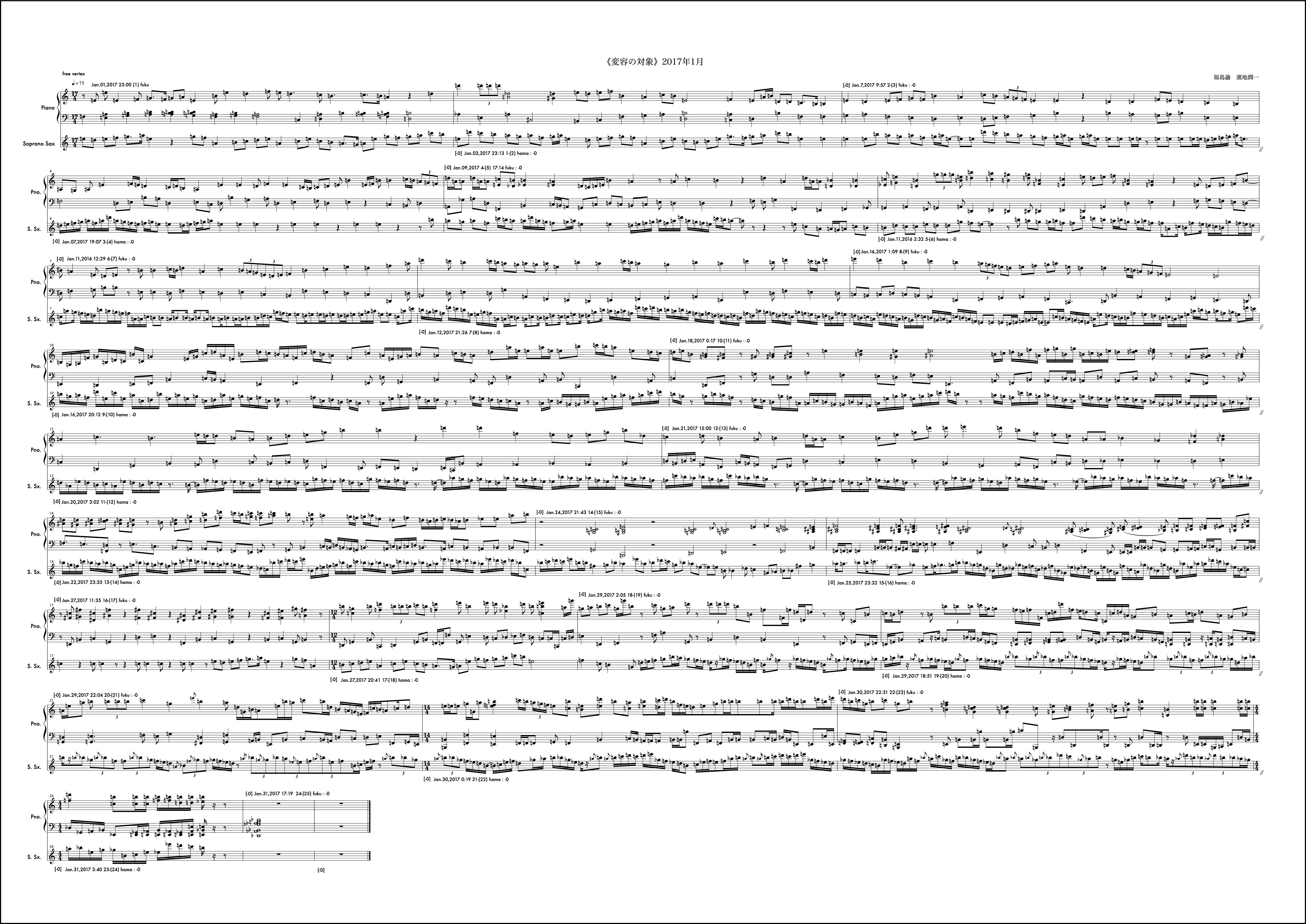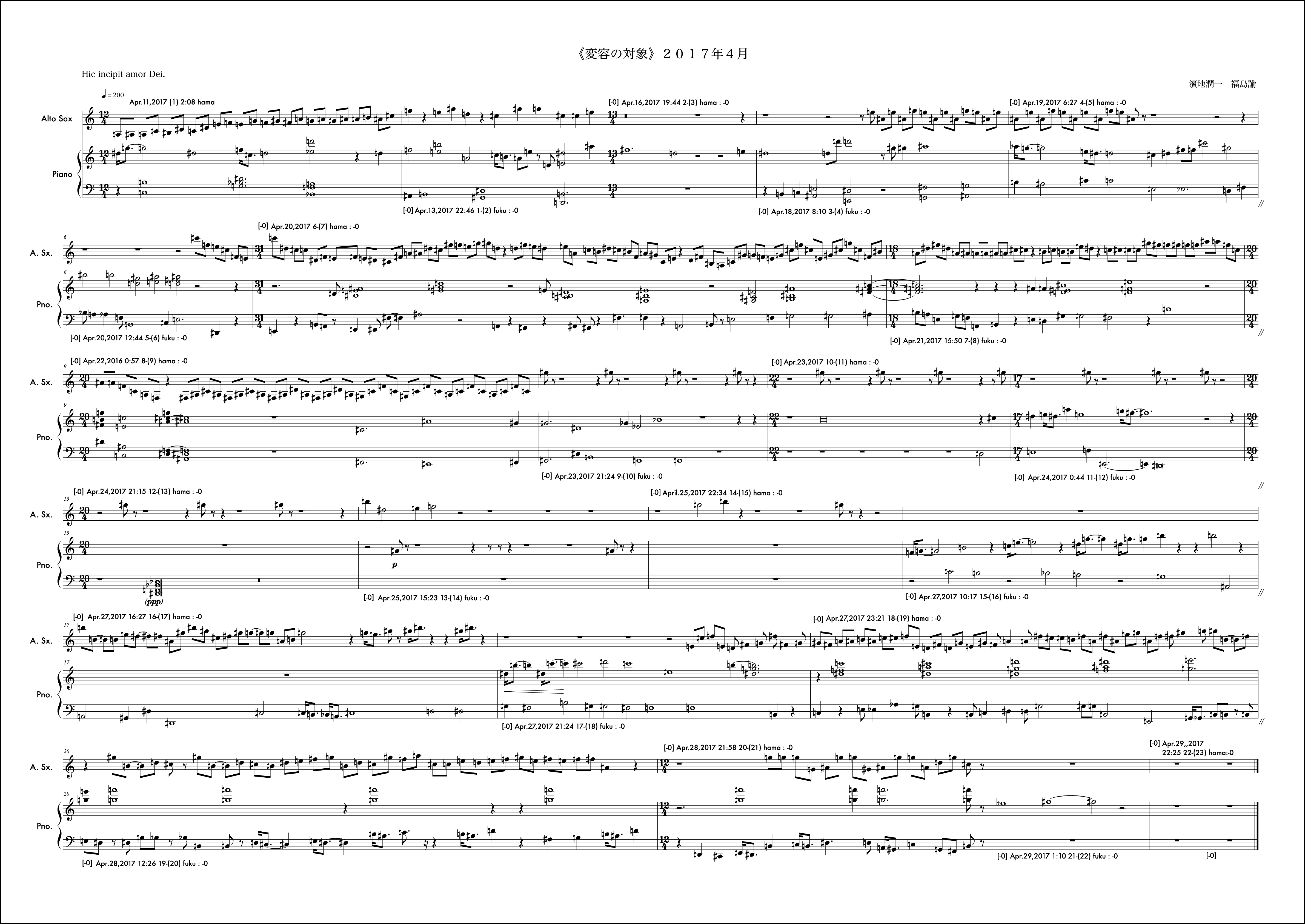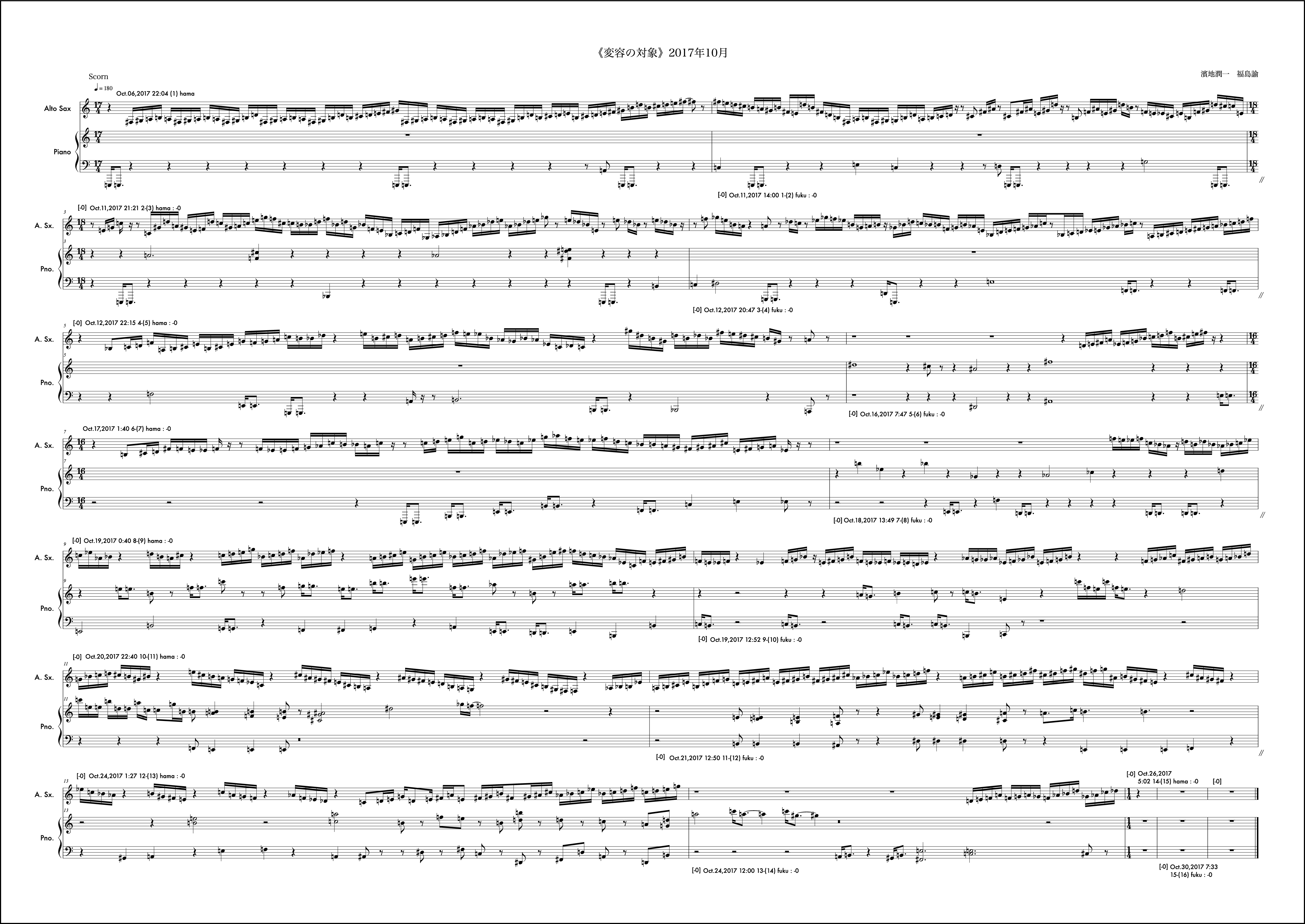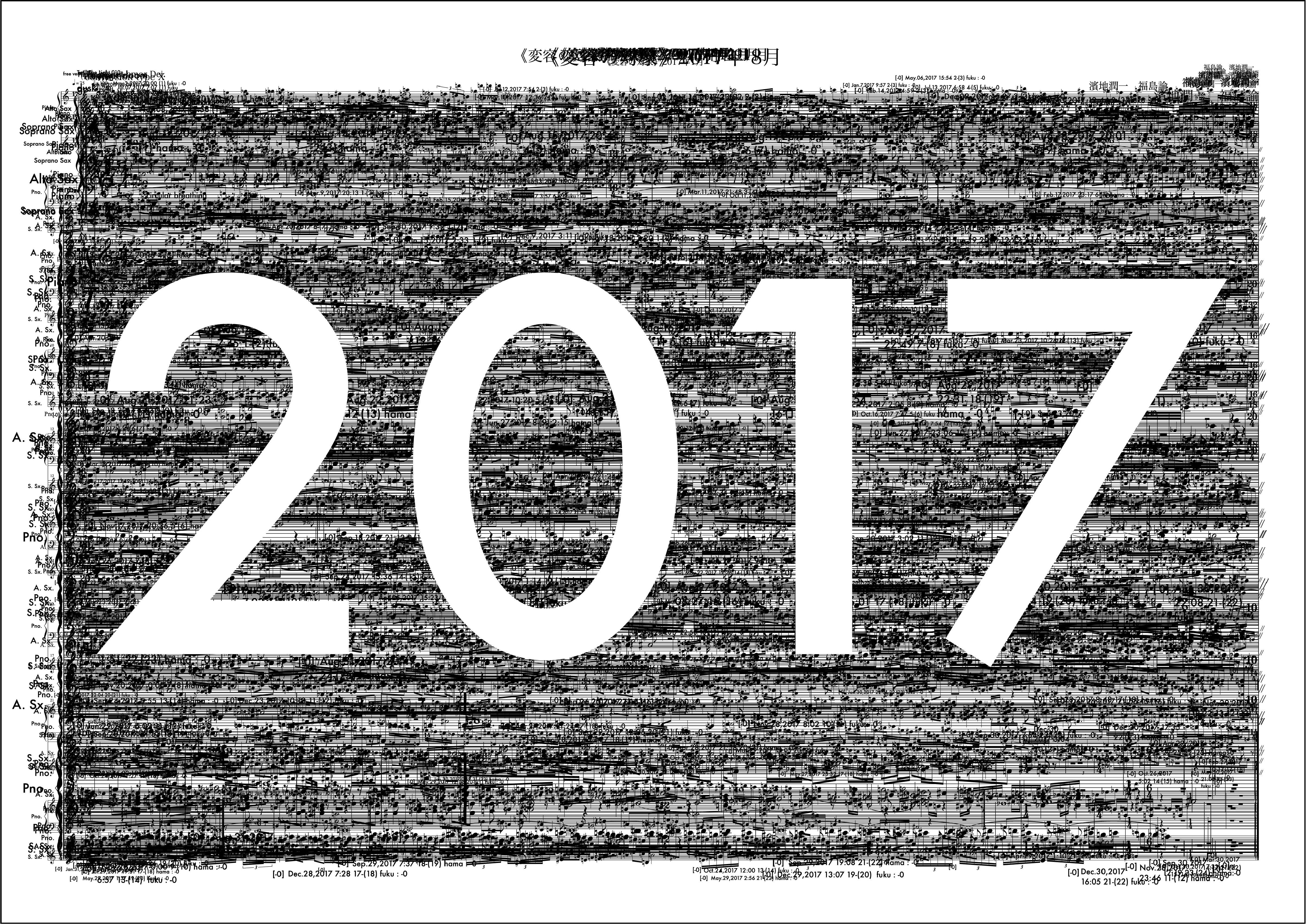 2017年12月31日の21時に濱地潤一さんからのメール連絡を受けて、2017年版《変容の対象》も無事に12曲の作曲を終えることができた。これで9年分の《変容の対象》が完成された。《変容の対象》は、1年で12曲が作曲されるので、ここまでで(9年×12曲=)108曲の共作が生み出されたことになる。濱地潤一と福島諭の五線譜を介した作曲(交換作曲形式)を行ってきた《変容の対象》は、9年目を終えて「楽想のあり方」自体には落ち着いたものを感じている。現在《変容の対象》で表現し得る領域は、おおよその許容範囲が見えている状態にはあり、そこには嘗て作品としての純度が高く残った領域もあれば、この形式では上手く留まらない領域もある、その辺りの判断は大分整理されてきているように感じている。そんな中にあって、かつてのように未だ知らない領域を求めるようにヒリヒリとした感覚を持ちながら作曲するというようなことは少なくなっているとは思う一方で、各月で提示される第一動機からどのように楽想が形作られていくかの興味は未だ尽きることはなかった、というのが2017年版を作曲していて感じられた基本姿勢だったと思う。