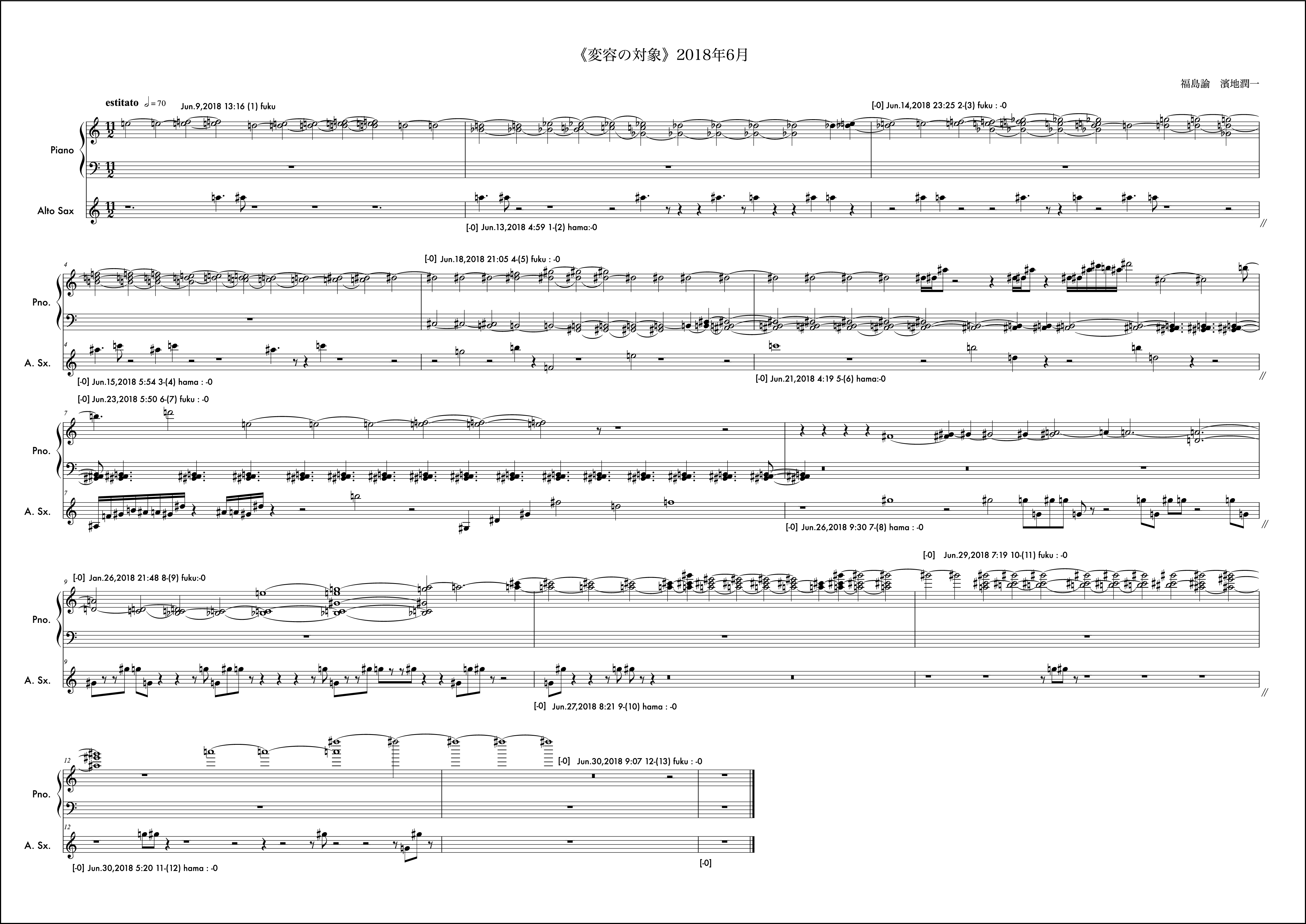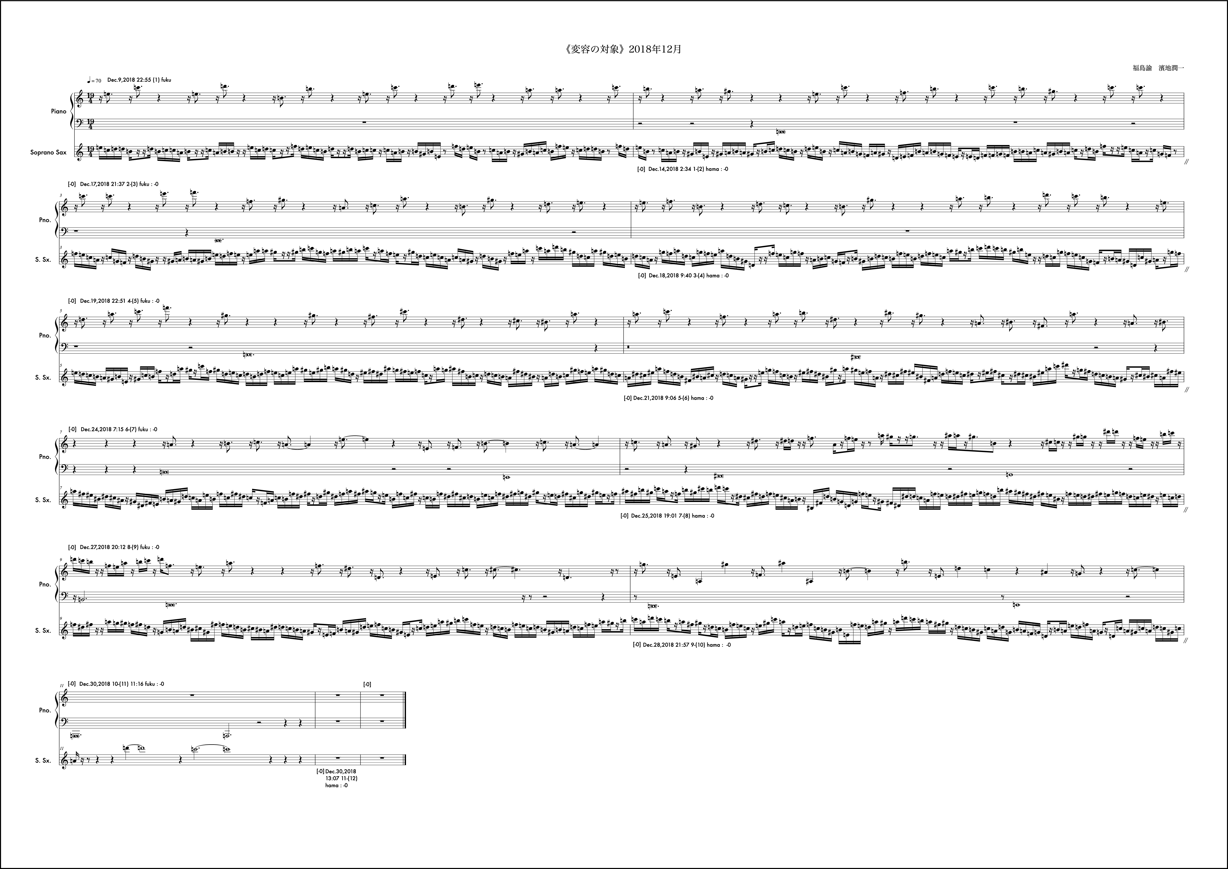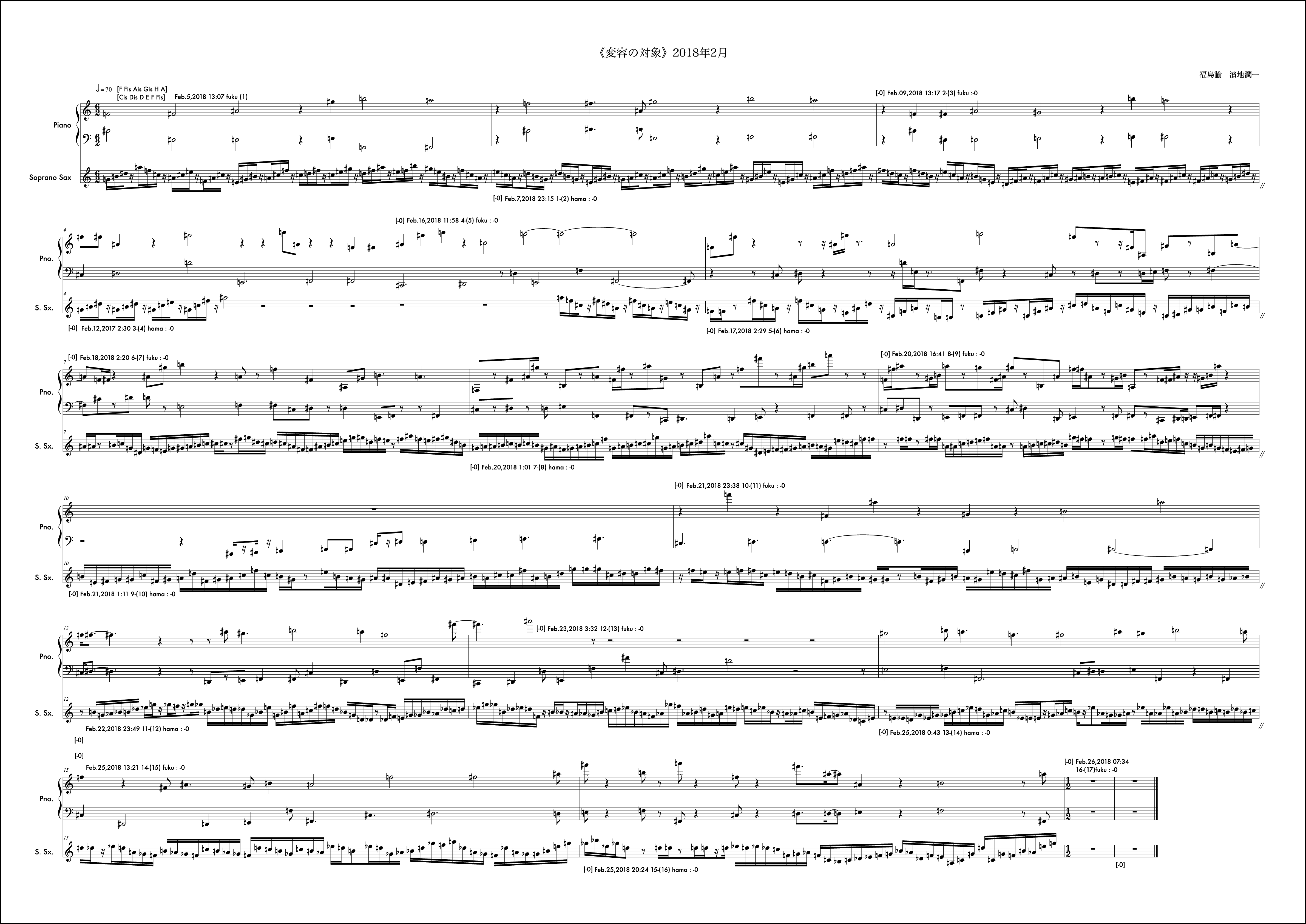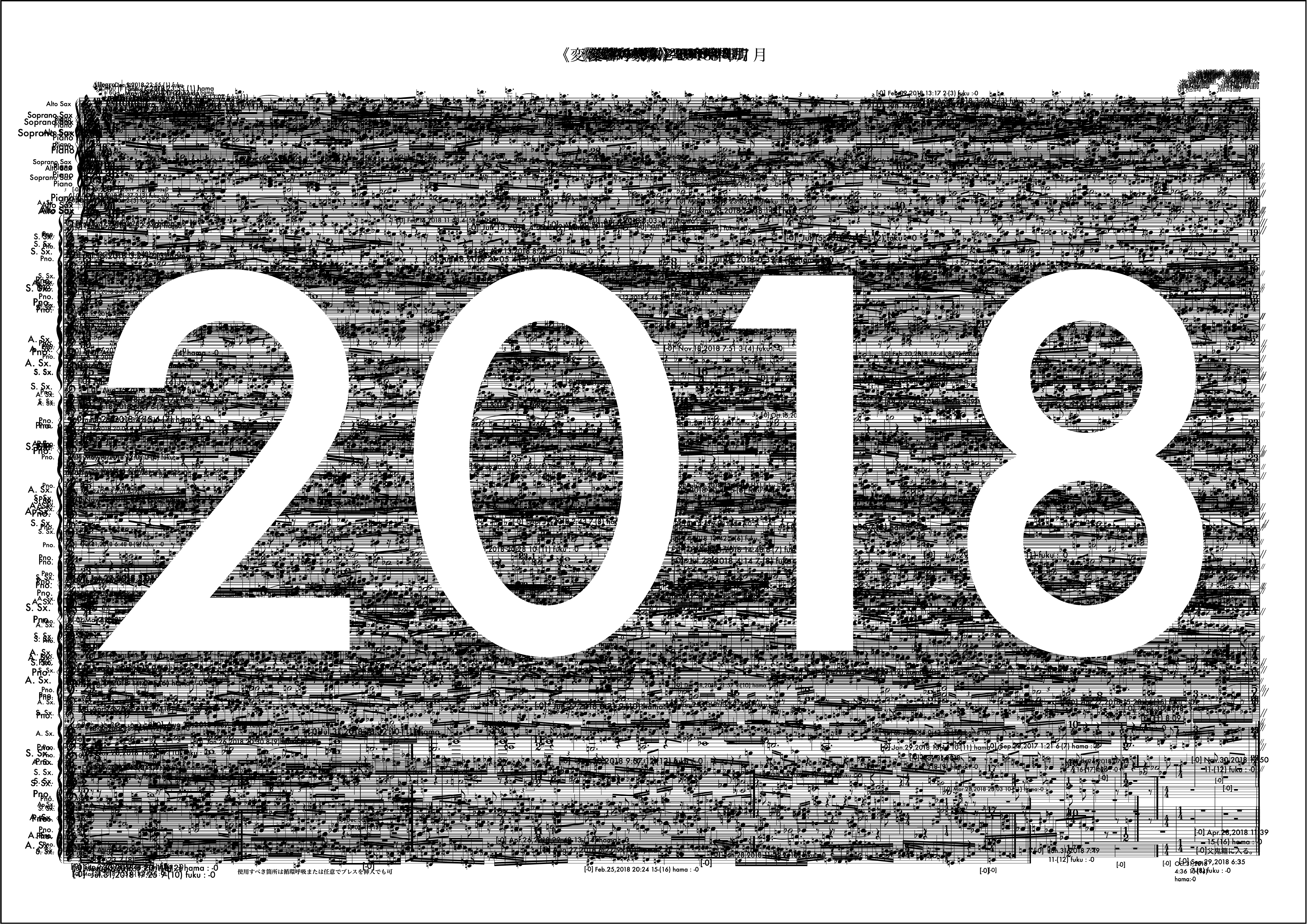 冒頭文はなし。2018年は冒頭文を書かないということに決めていた。数年それは続いたし、意味も見出せているが年初にそう決めたことを覚えている。動機は自分から。2018年最初の作品であるし、自身の実際のアルト・サクソフォンの演奏形態の雛形の一つを楽譜上に再現するような書き方をした。動機時点でそう考え書き出しても福島さんの提示する組織によってはその方向性を変えざるを得ない場合もこの作品では頻繁に起こり、また、それがある驚きを連れてくるという、そういう構造を持っているが、この月に関しては福島さんの提示する組織とうまく自分の思考の方向性の親和度が高く、最後まで輪郭を持った意識で書くことができたようだ。ようだ、と書くのはその譜面を確認してそう読み取れるからで、記憶から零れ落ちたそれら当時の感触はもうすでに自分の中からきれいさっぱり無くなっており、この眼前の譜面だけが頼りである。譜面というメディアの強度の一つの証だと思う。