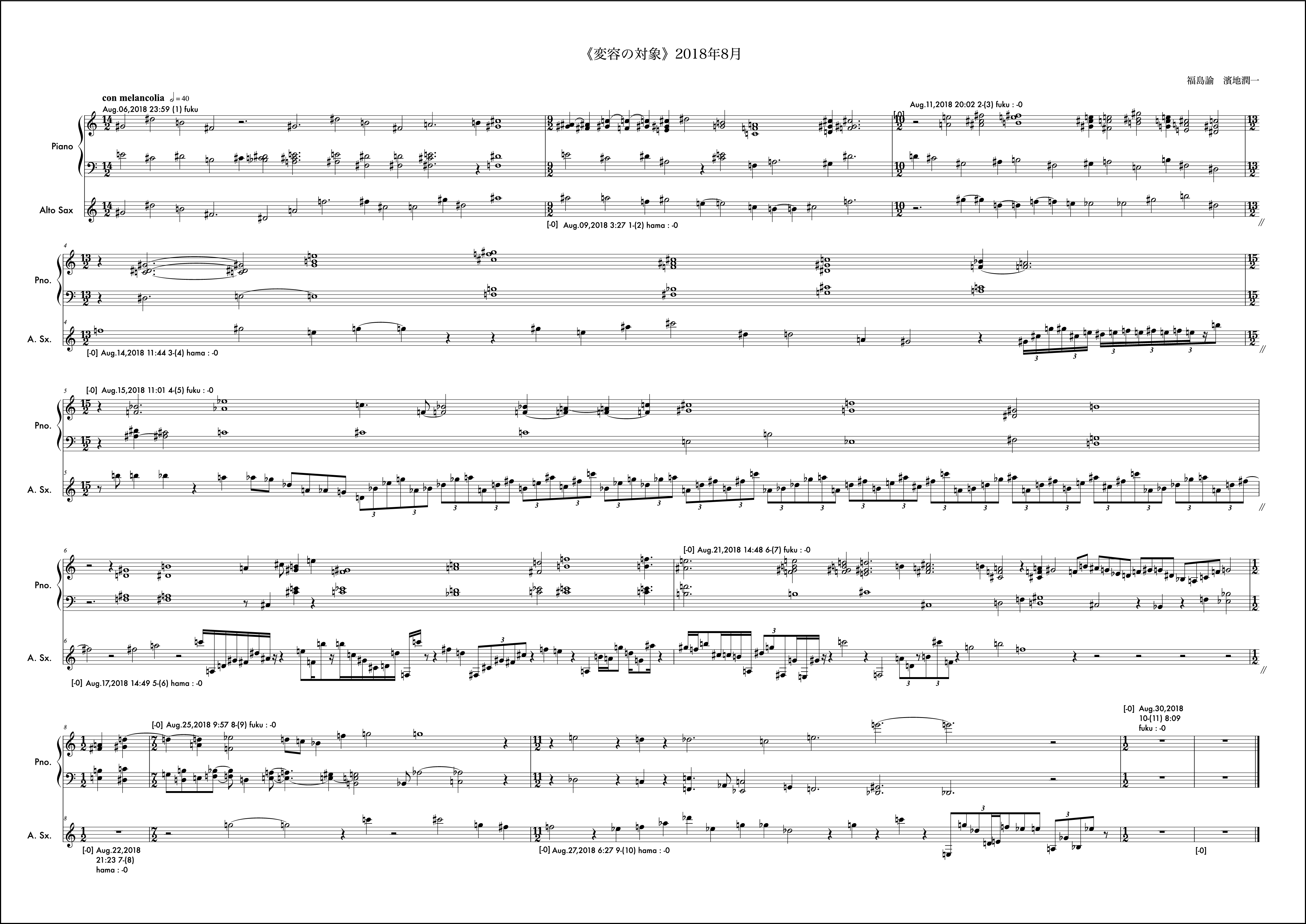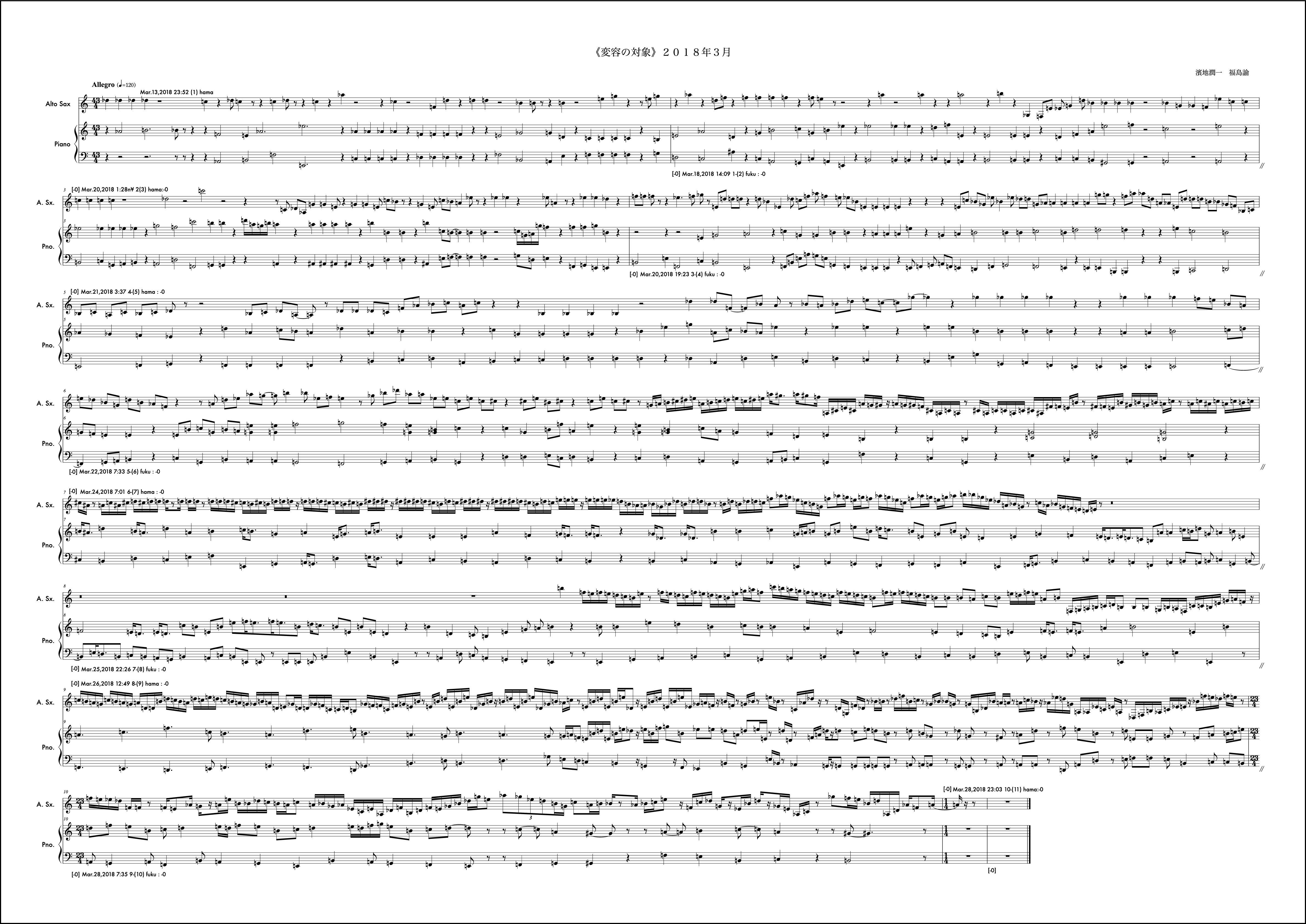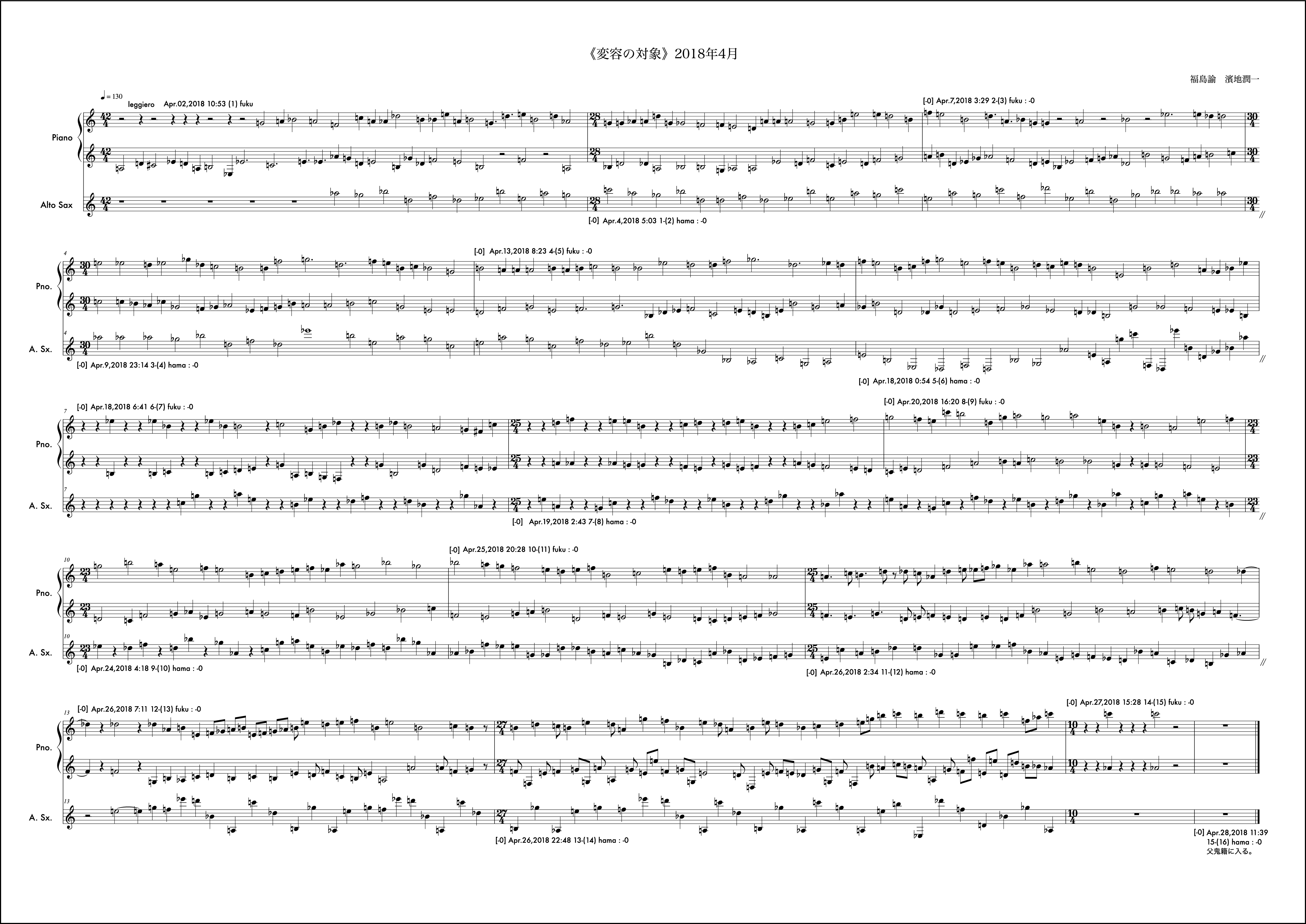 冒頭文はなし。2018年は冒頭文を書かないということに決めていた。数年それは続いたし、意味も見出せているが年初にそう決めたことを覚えている。動機は自分から。2018年最初の作品であるし、自身の実際のアルト・サクソフォンの演奏形態の雛形の一つを楽譜上に再現するような書き方をした。動機時点でそう考え書き出しても福島さんの提示する組織によってはその方向性を変えざるを得ない場合もこの作品では頻繁に起こり、また、それがある驚きを連れてくるという、そういう構造を持っているが、この月に関しては福島さんの提示する組織とうまく自分の思考の方向性の親和度が高く、最後まで輪郭を持った意識で書くことができたようだ。ようだ、と書くのはその譜面を確認してそう読み取れるからで、記憶から零れ落ちたそれら当時の感触はもうすでに自分の中からきれいさっぱり無くなっており、この眼前の譜面だけが頼りである。譜面というメディアの強度の一つの証だと思う。