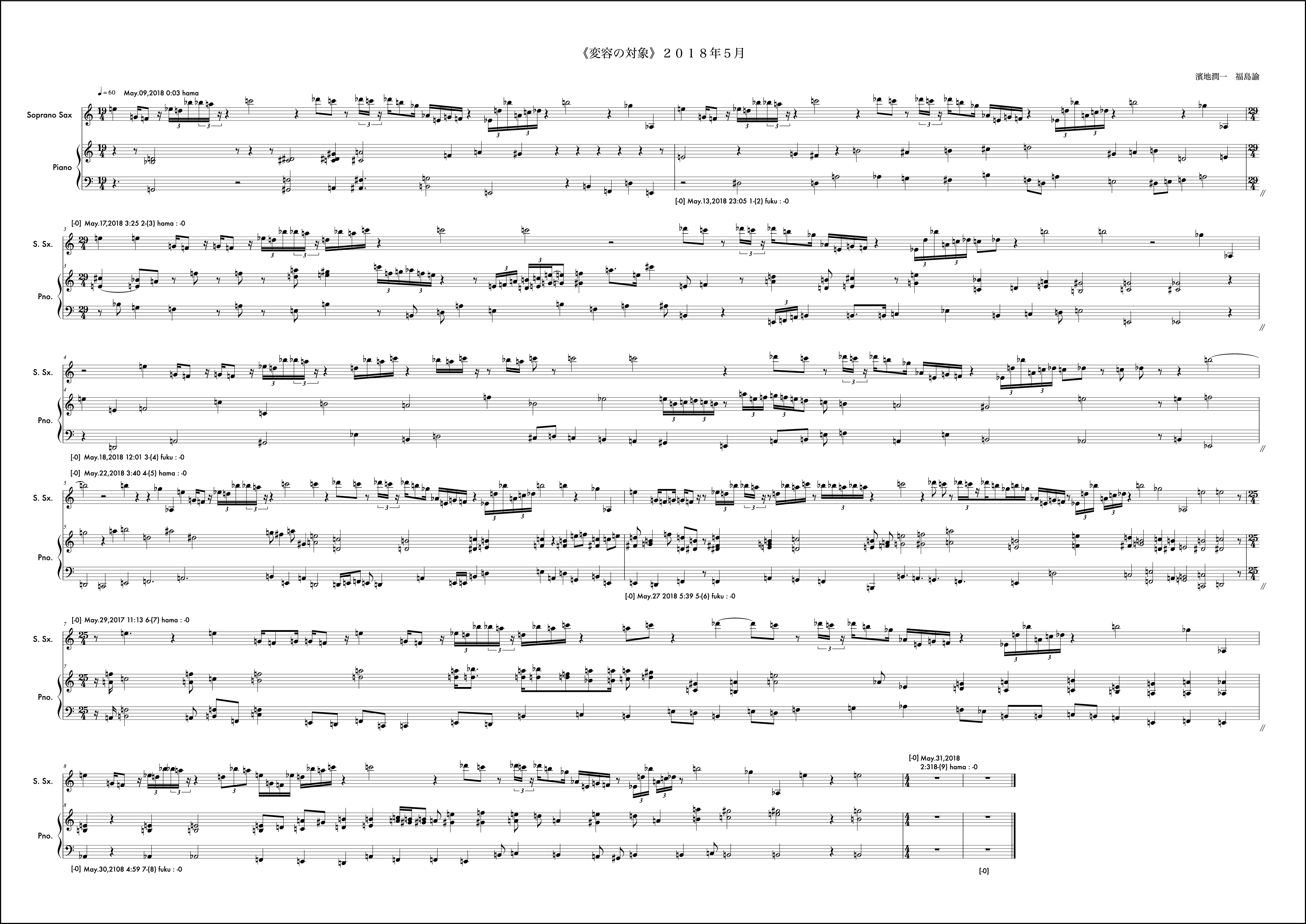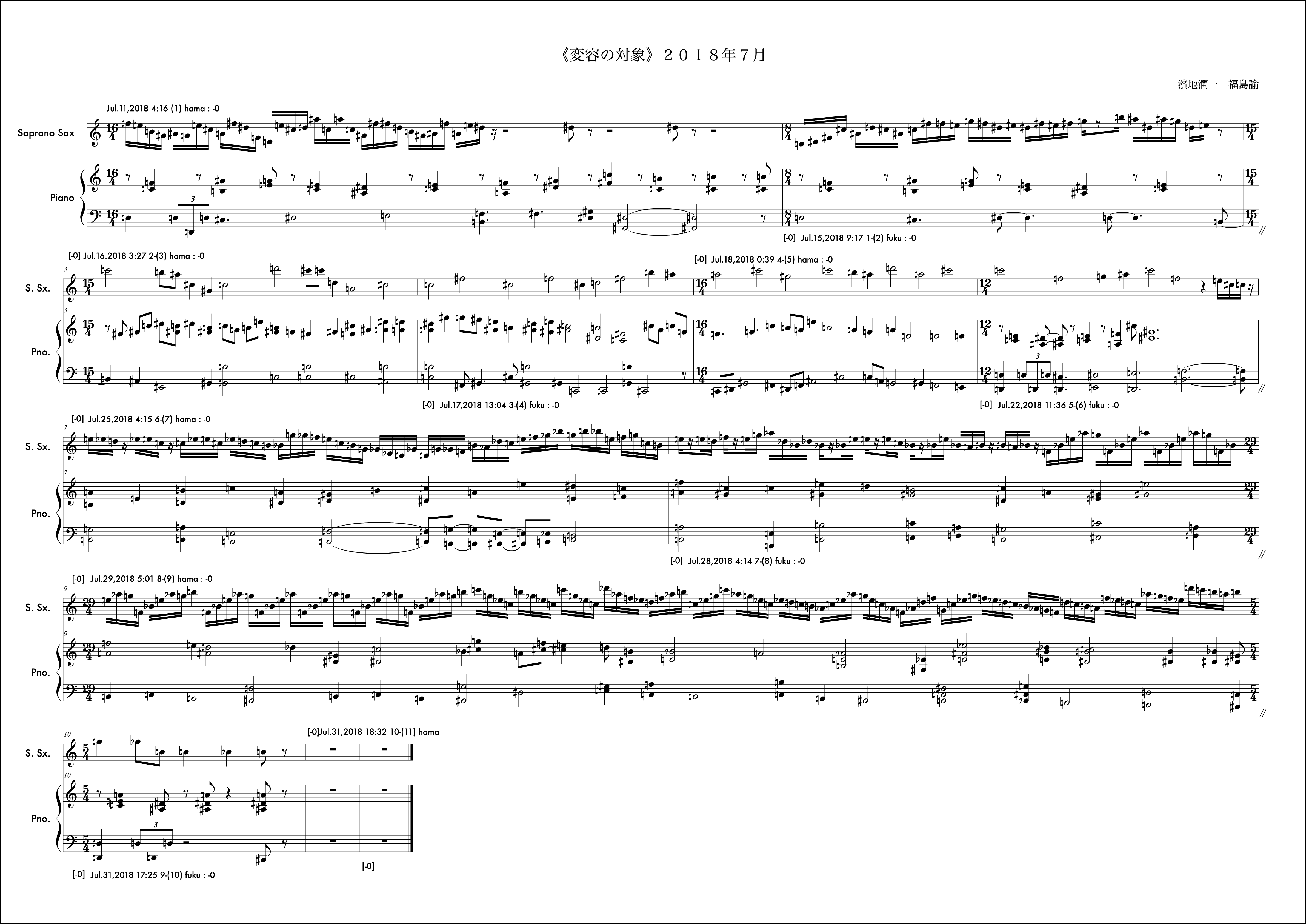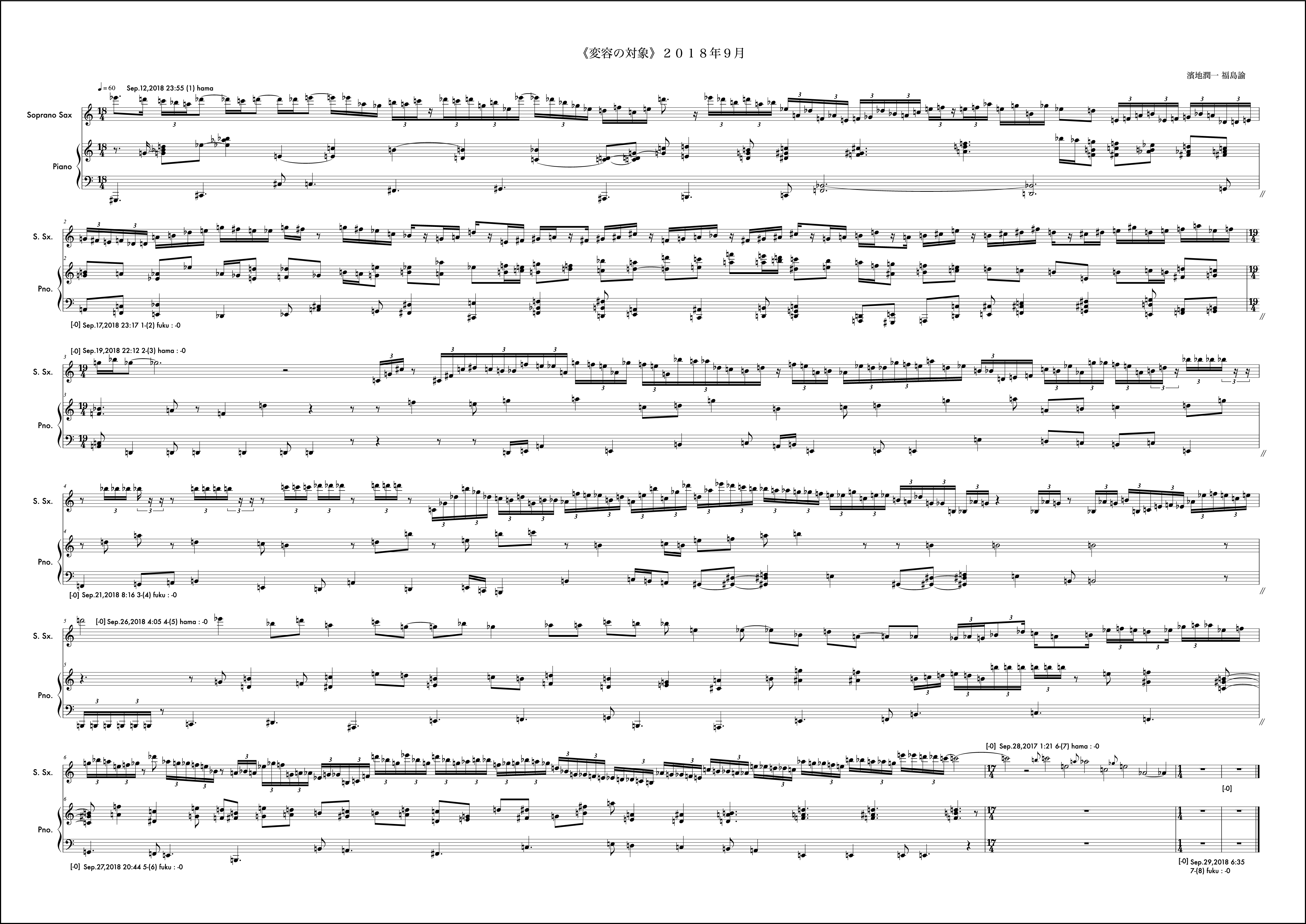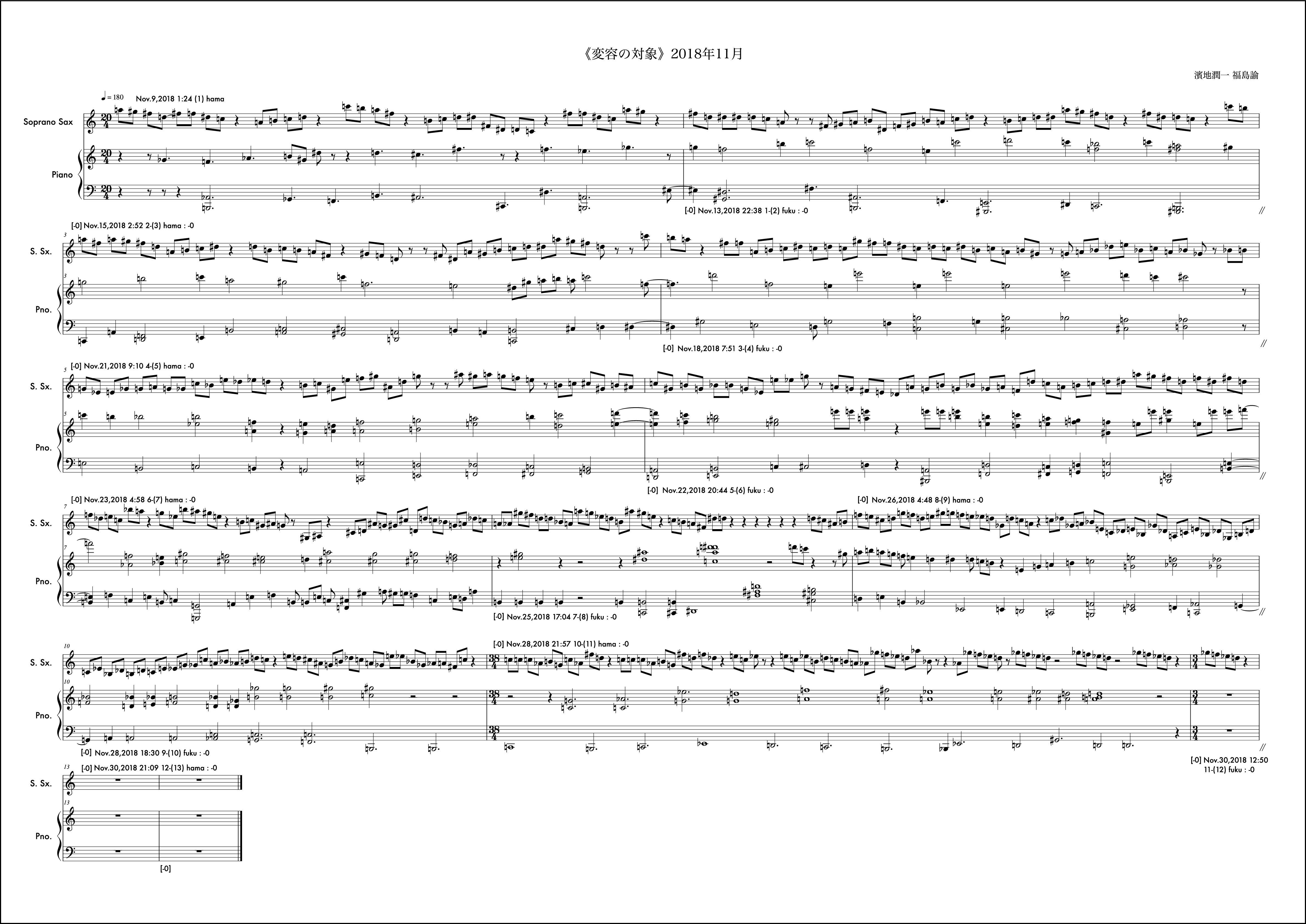 冒頭文はなし。2018年は冒頭文を書かないということに決めていた。数年それは続いたし、意味も見出せているが年初にそう決めたことを覚えている。動機は自分から。2018年最初の作品であるし、自身の実際のアルト・サクソフォンの演奏形態の雛形の一つを楽譜上に再現するような書き方をした。動機時点でそう考え書き出しても福島さんの提示する組織によってはその方向性を変えざるを得ない場合もこの作品では頻繁に起こり、また、それがある驚きを連れてくるという、そういう構造を持っているが、この月に関しては福島さんの提示する組織とうまく自分の思考の方向性の親和度が高く、最後まで輪郭を持った意識で書くことができたようだ。ようだ、と書くのはその譜面を確認してそう読み取れるからで、記憶から零れ落ちたそれら当時の感触はもうすでに自分の中からきれいさっぱり無くなっており、この眼前の譜面だけが頼りである。譜面というメディアの強度の一つの証だと思う。