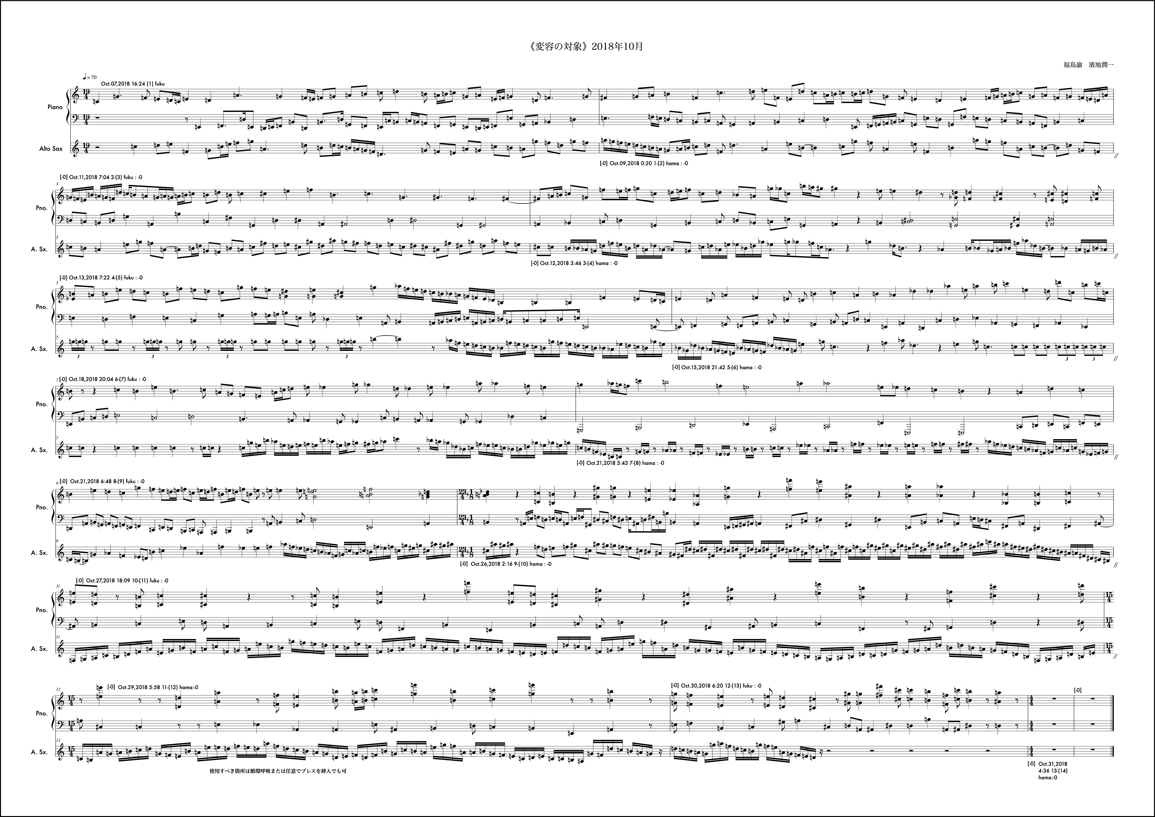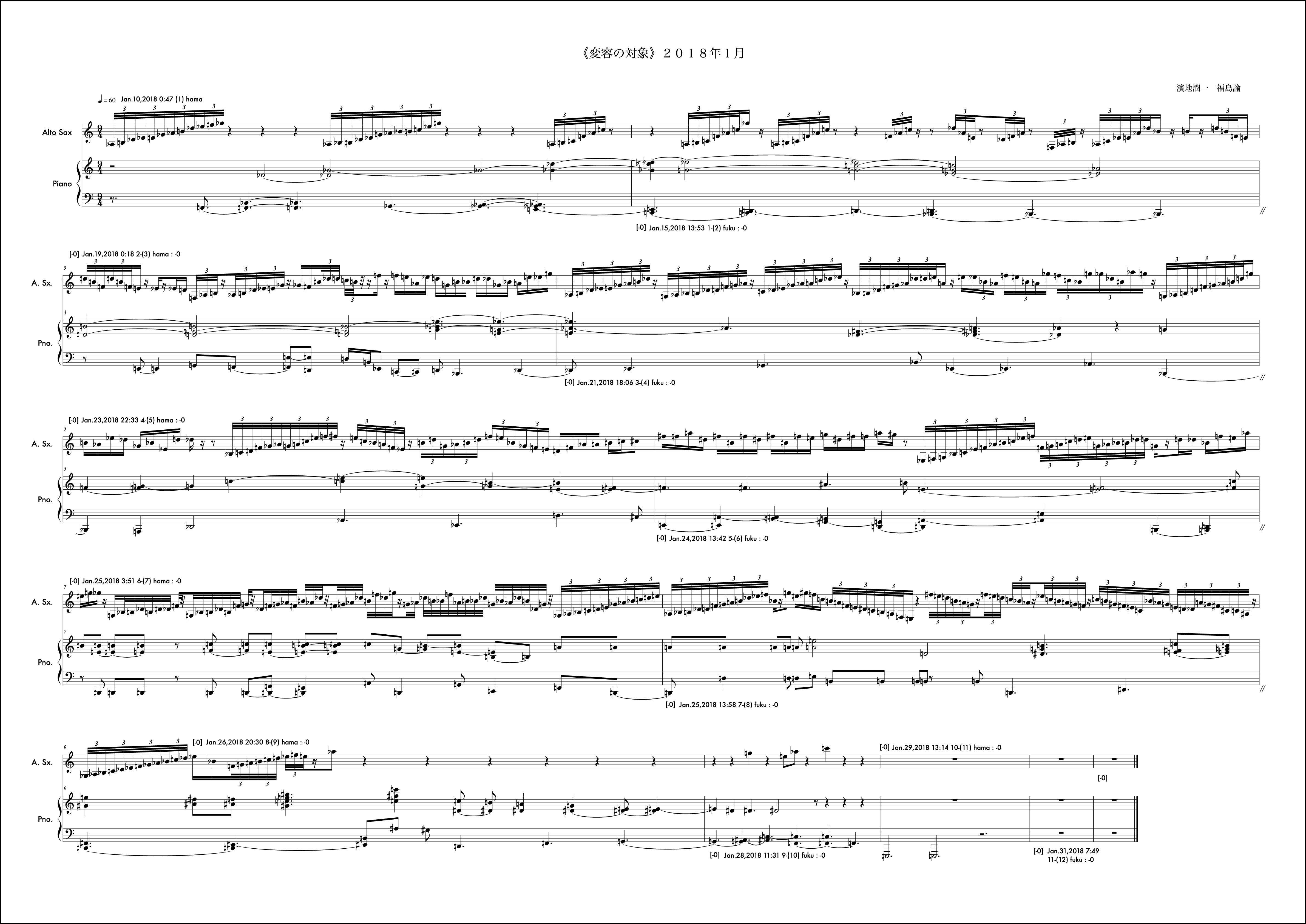 濱地潤一さんの第一小節目から開始されてる。全体的な印象は、モノクローム、高速と低速の対比、カタストロフ、断絶、沈黙。高速で上昇するアルトのパッセージの連続にピアノはゆっくりとした響きの推移によって対比する。当初濱地さんからのパッセージを軽く分析した資料は残っていたが、時間の都合もあり明確な対処を導き出す前に書き出している。ピアノはタイで音の長さを繋いで行き、横の流れで響きを組織することに意識的だった。通して聴くと、7小節目からピアノの連打音がそれまでの流れを断ち切っているようにきこえる。全体のバランスが崩れ9小節目後半のアルトの沈黙、10小節目に突如現れる旋律の断片、ピアノは重く低音を鳴らし終わる。この最後のピアノの振る舞いは2018年12月の終始と類似している。12月作曲時はこの1月のことは全く忘れていたにしろ。