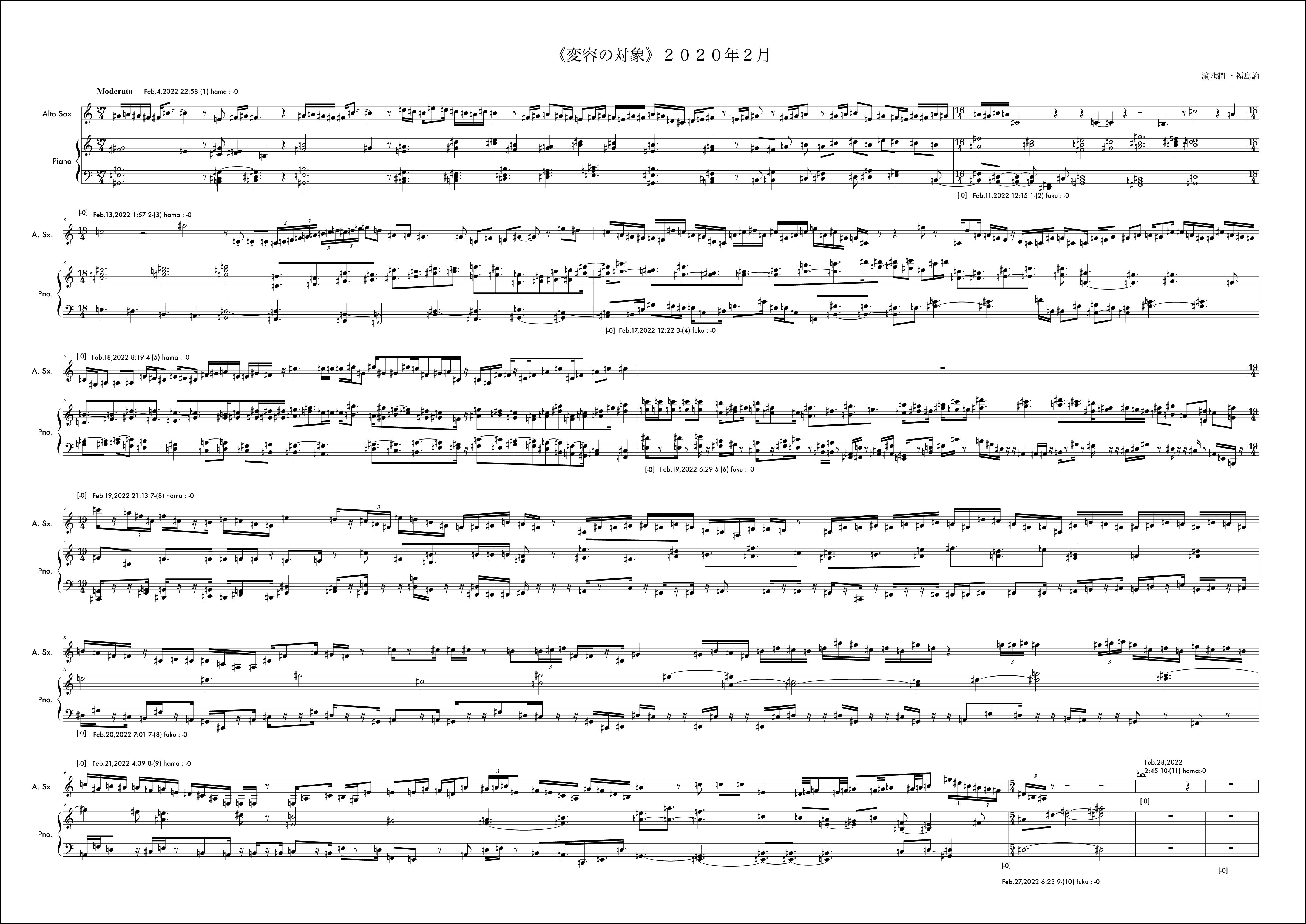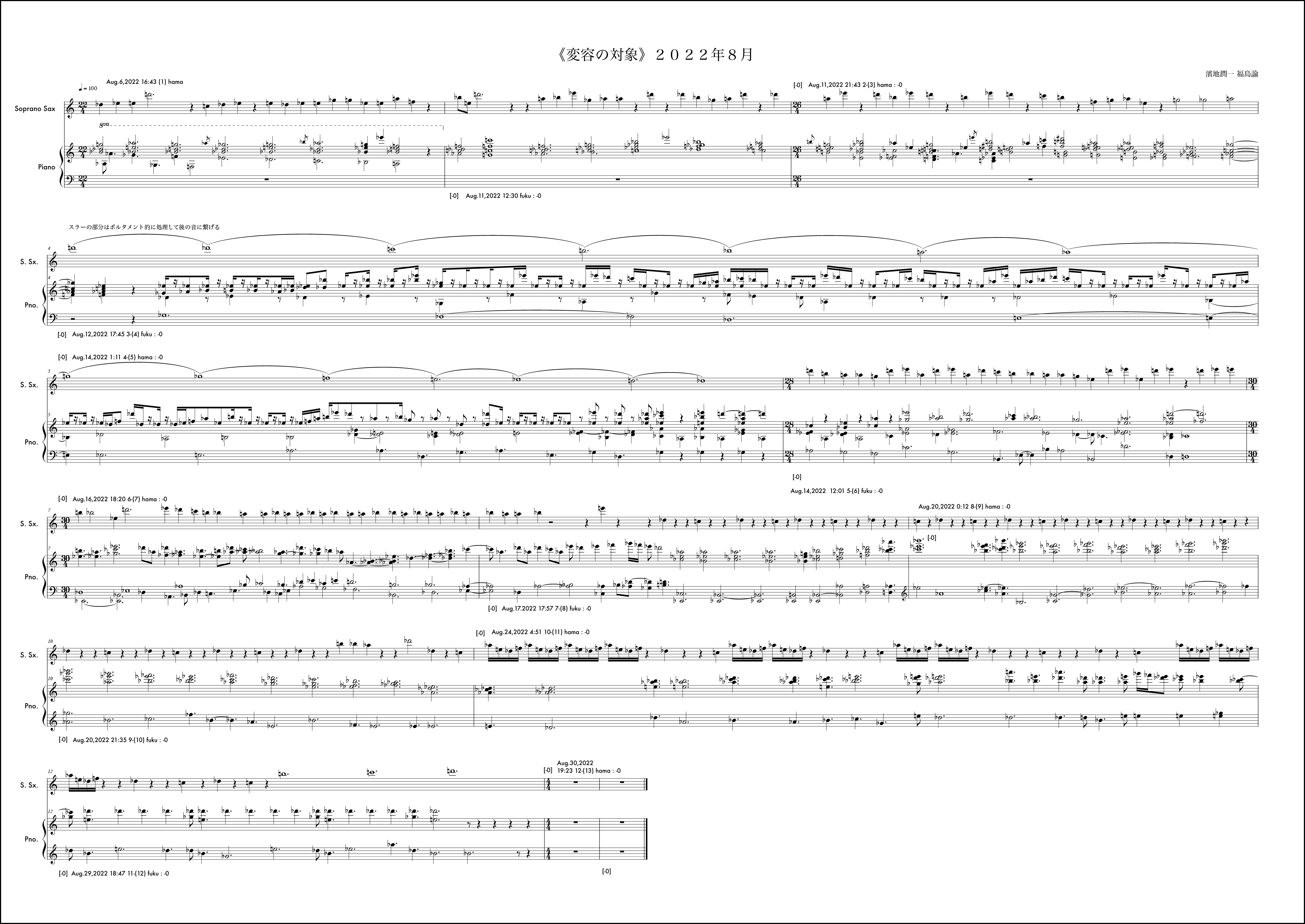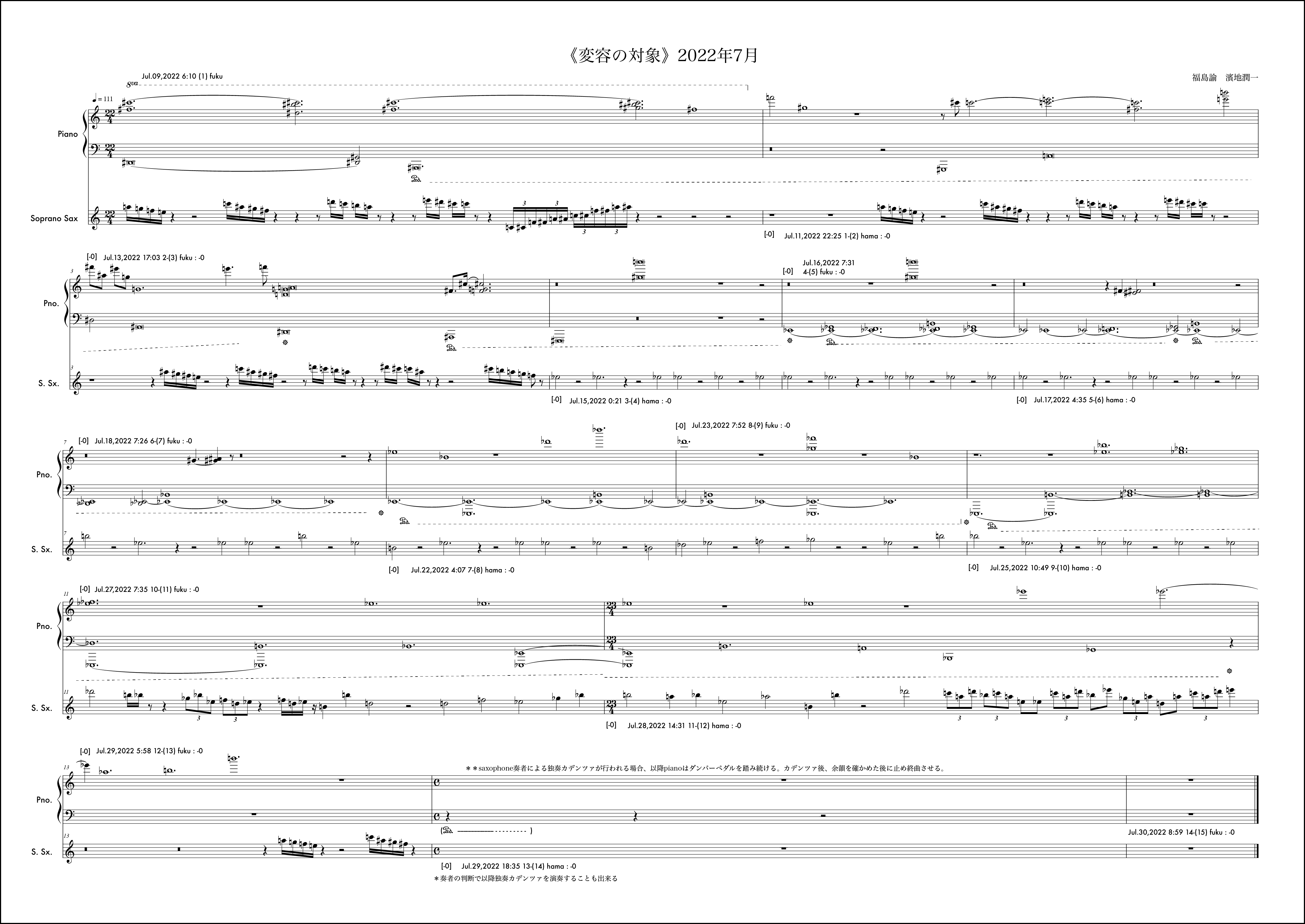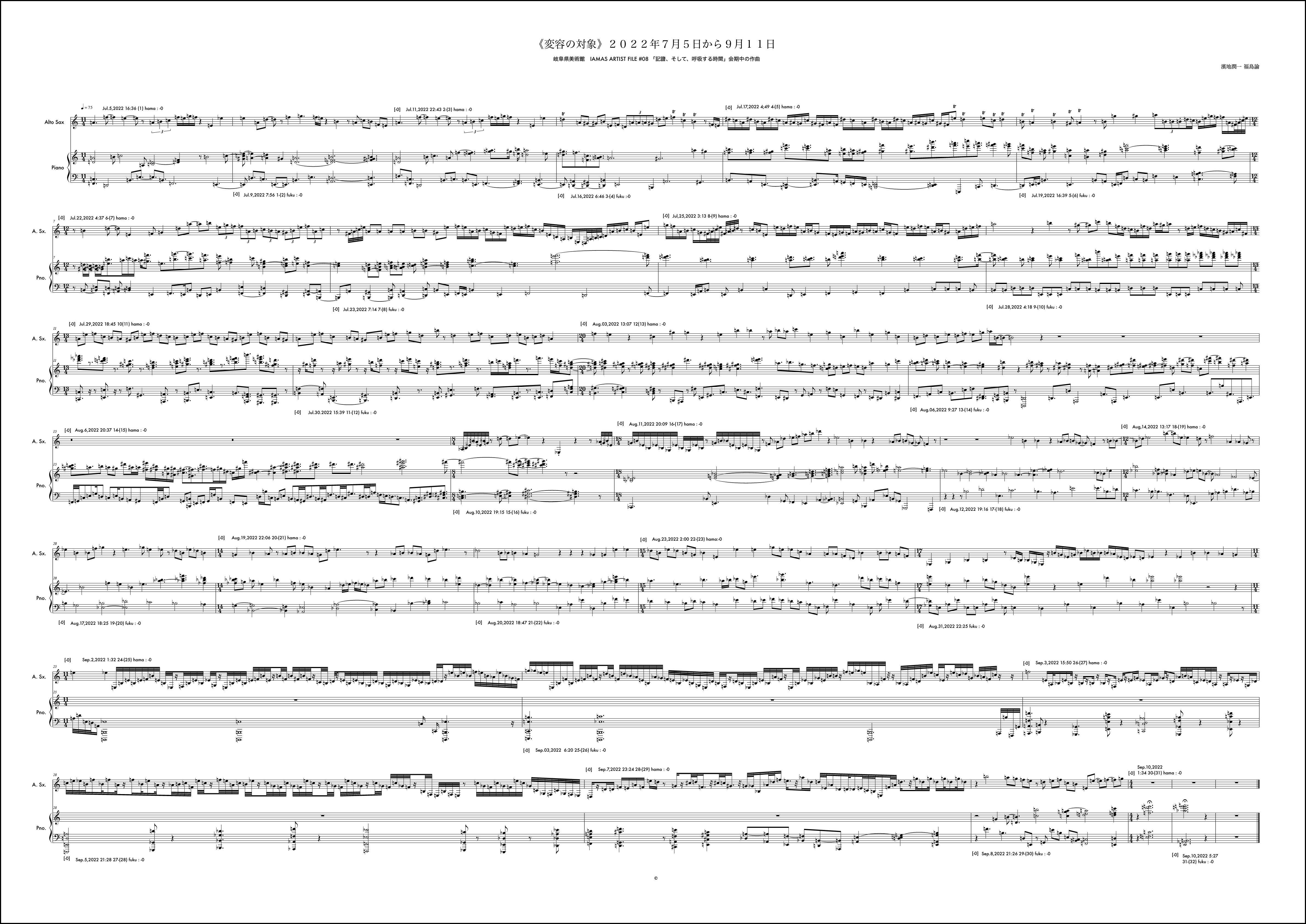 毎月の《変容の対象》の作曲に並行しながら、岐阜県美術館での展示期間に合わせたもう一つの《変容の対象》を例外的に行なっていた。7月5日から開始されるが、7月は通常の《変容の対象》で福島から開始されていたこともあり、ここでは濱地が第1小節目を受け持っている。冒頭の1小節目から明確なテーマが提示されている。このテーマは結局楽曲全体を通じてピアノにも浸透し、サクソフォンにも何度も回帰されるものとなった。そのような意思が感じられるのは3小節目のサクソフォンに早くも冒頭のテーマがリフレインされることにも顕著である。福島がそれを受け取りその後の展開にこのテーマの断片を幾度も練り込もうと試みるきっかけにもなった。基本姿勢はそれだとしても、場面は様々に変化していく。急激な変化が感じられるところはおおよそ6箇所と見ていいだろう。具体的には11小節目、13小節目、15小節目、18小節目、25小節目、そして30小節目だ。11小節目は10小節目までに高まった楽想がここで一つの区切りを迎え、次の場所を探すように移行に向かう。サクソフォンに大きな動きは見られない。13小節目でピアノがこれまでの響きから別の場面に断絶する。しかしここではもともとサクソフォンのテーマの変形がみられるため、全体の印象としてはサクソフォンがテーマへの再起を促すように感じられるかもしれない。15小節目ではピアノソロになり移行的な展開となる。18小節目ではピアノは素朴な展開に変化する。サクソフォンとの調和も静かに、対話的に整っている場面だと思う。25小節目で、9月に入った。展示期間も終盤という思いが作用していたかはわからないが、サクソフォンの流れに目を覚ますような、細かな密度の音が散りばめられる。ピアノはここで大きな低音で答えている。ここでのアプローチは通常の1ヶ月の《変容の対象》では出てこなかった要素だと感じていた。長い期間でいくつかの場面展開を経て到達する新しい様相なのかもしれない、と作曲時に考えていた。30小節目からは楽曲を締めくくる場面になるが、ピアノは最後の2つの和音を置くか、1つにしておくべきか、判断を任される形になった。最終日であったし、濱地さんのアプローチは31小節目を無音にすることで余韻を残し終わることを想定していたのかもしれない。音楽的にはその美しさもあると考えながら、今回の《変容の対象》が期間を特殊な形に設定した例外的なものであったことを考えて、最後に和音を付け加えてしまったのだと思う。全体の音楽的な内容からすれば蛇足に思える観念的な終止だったのかもしれない。