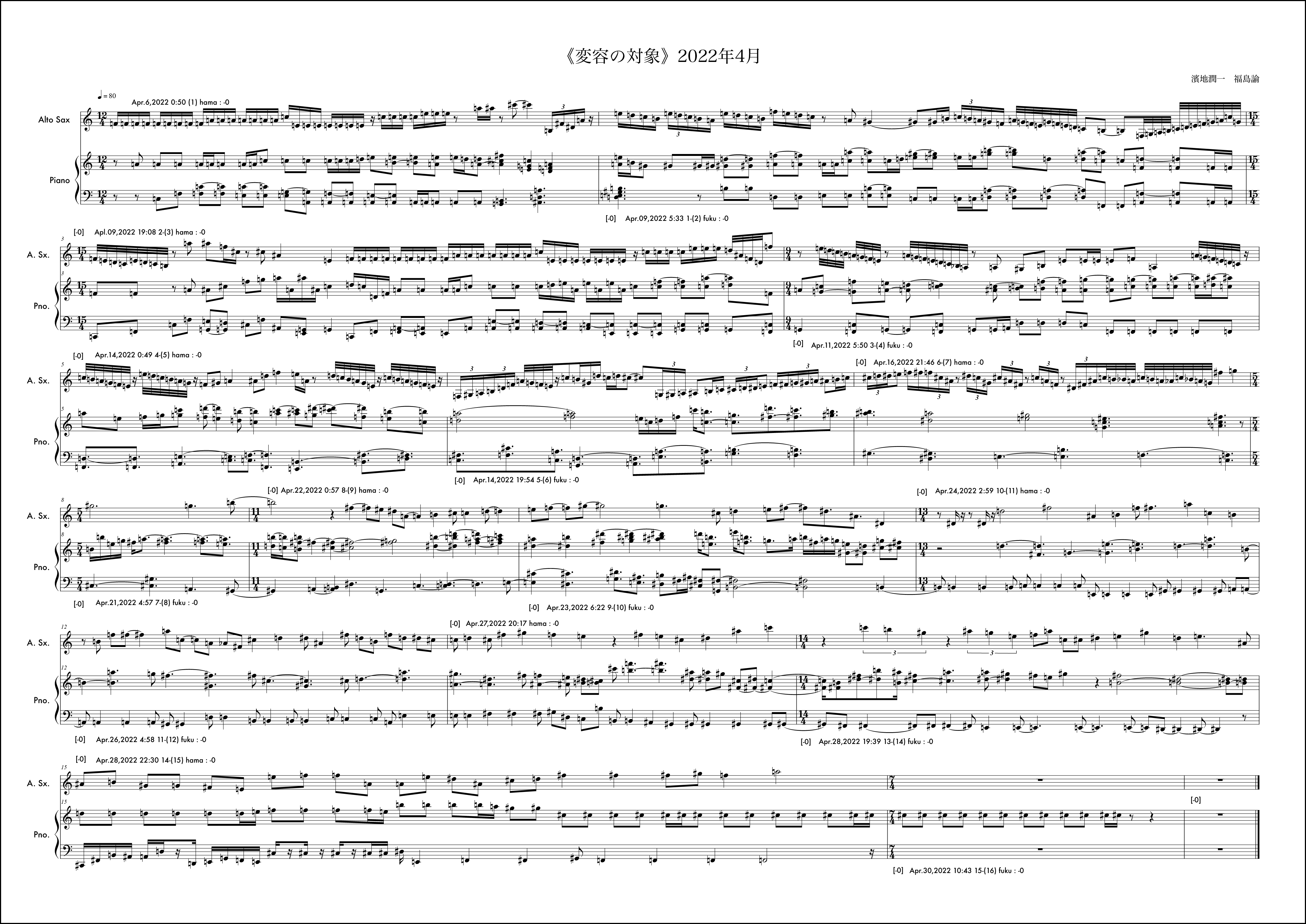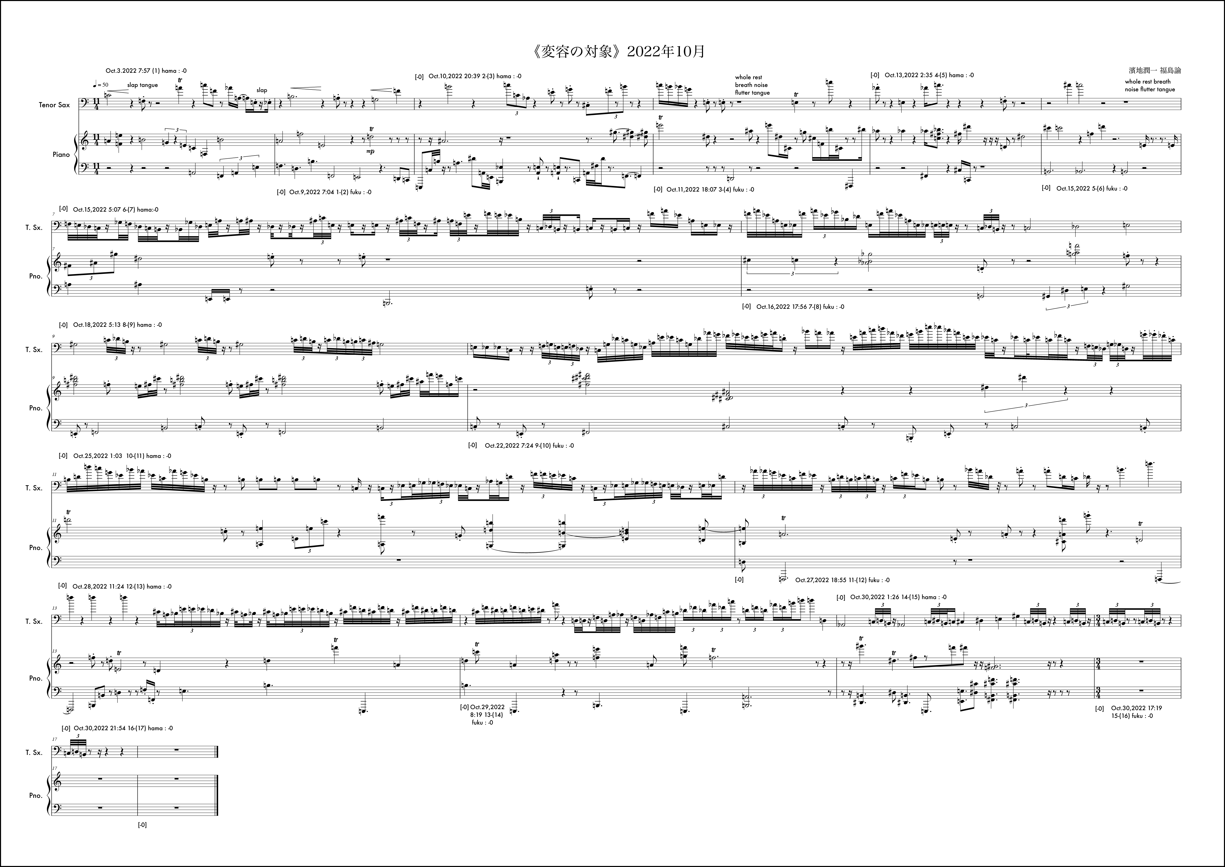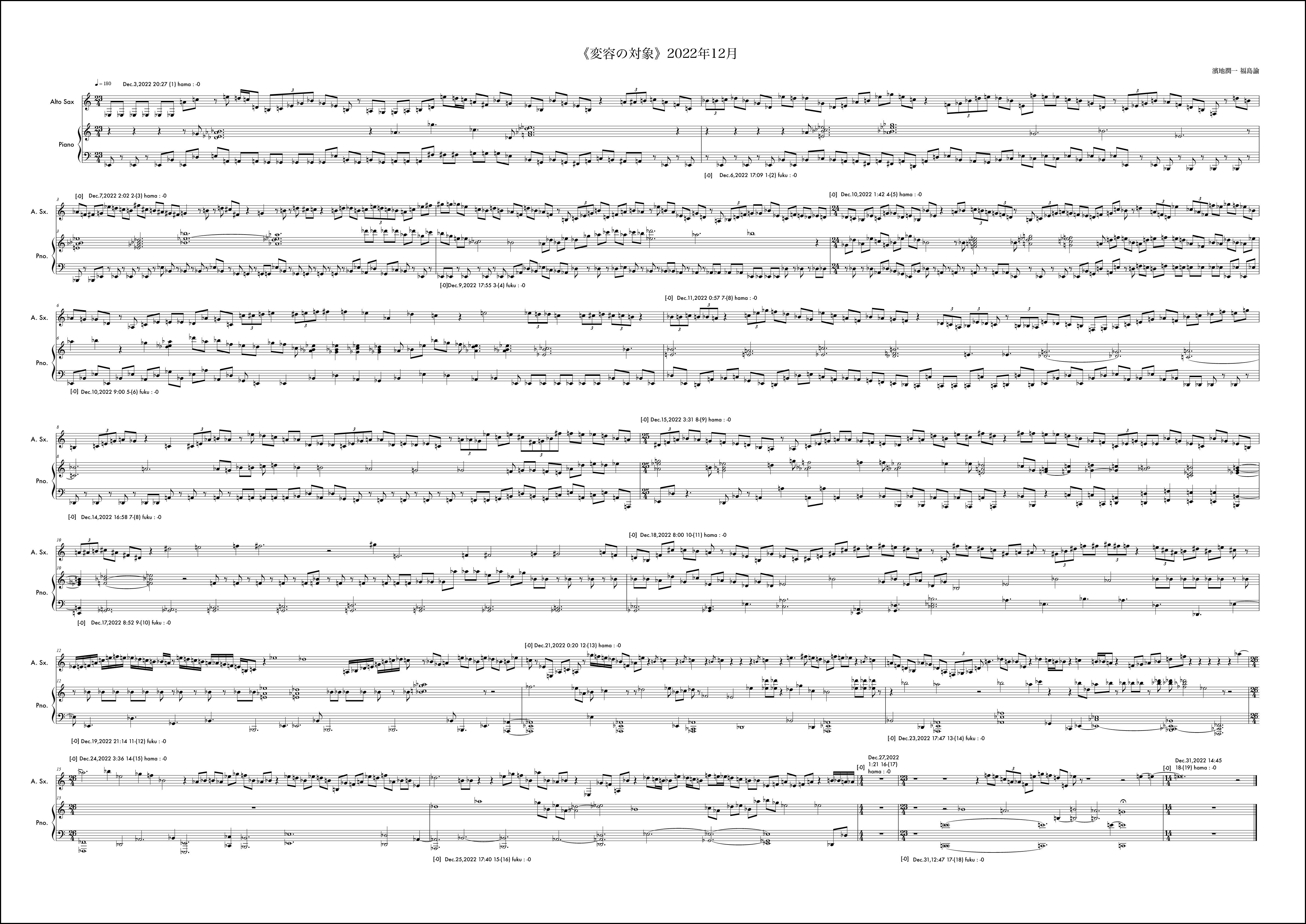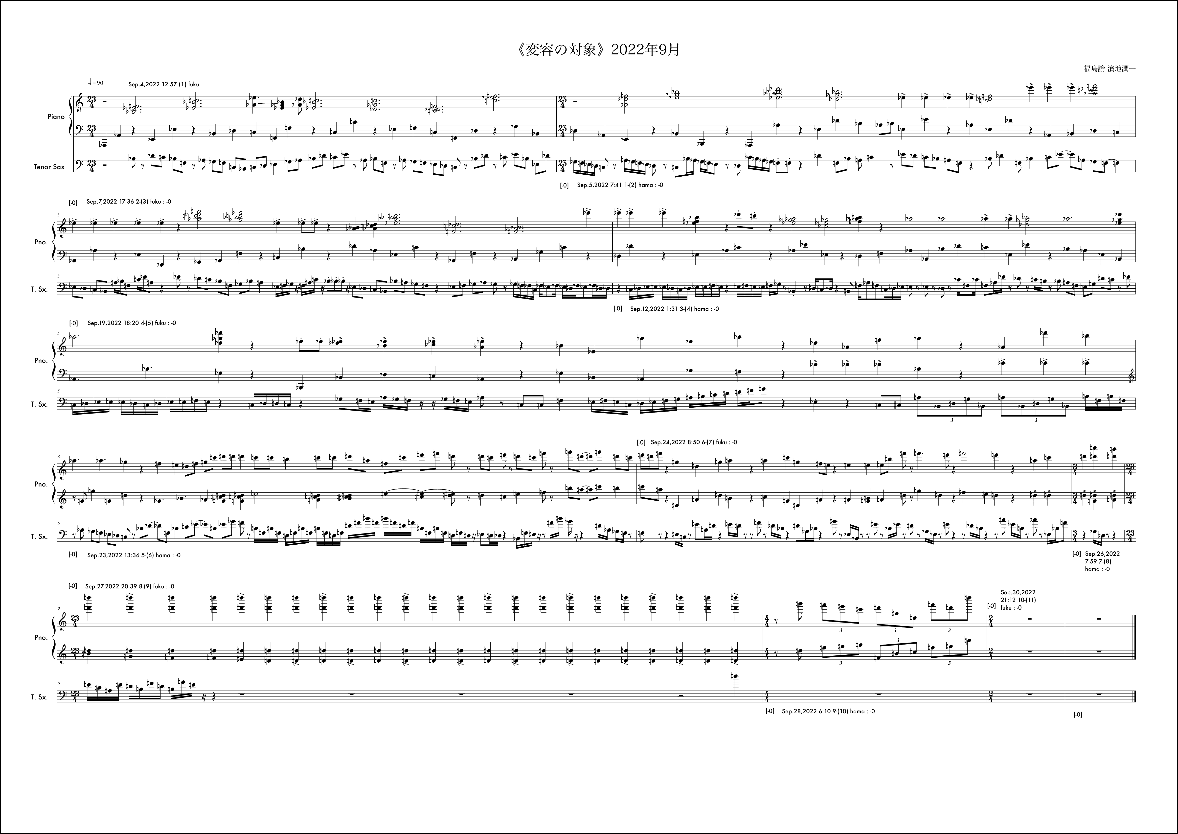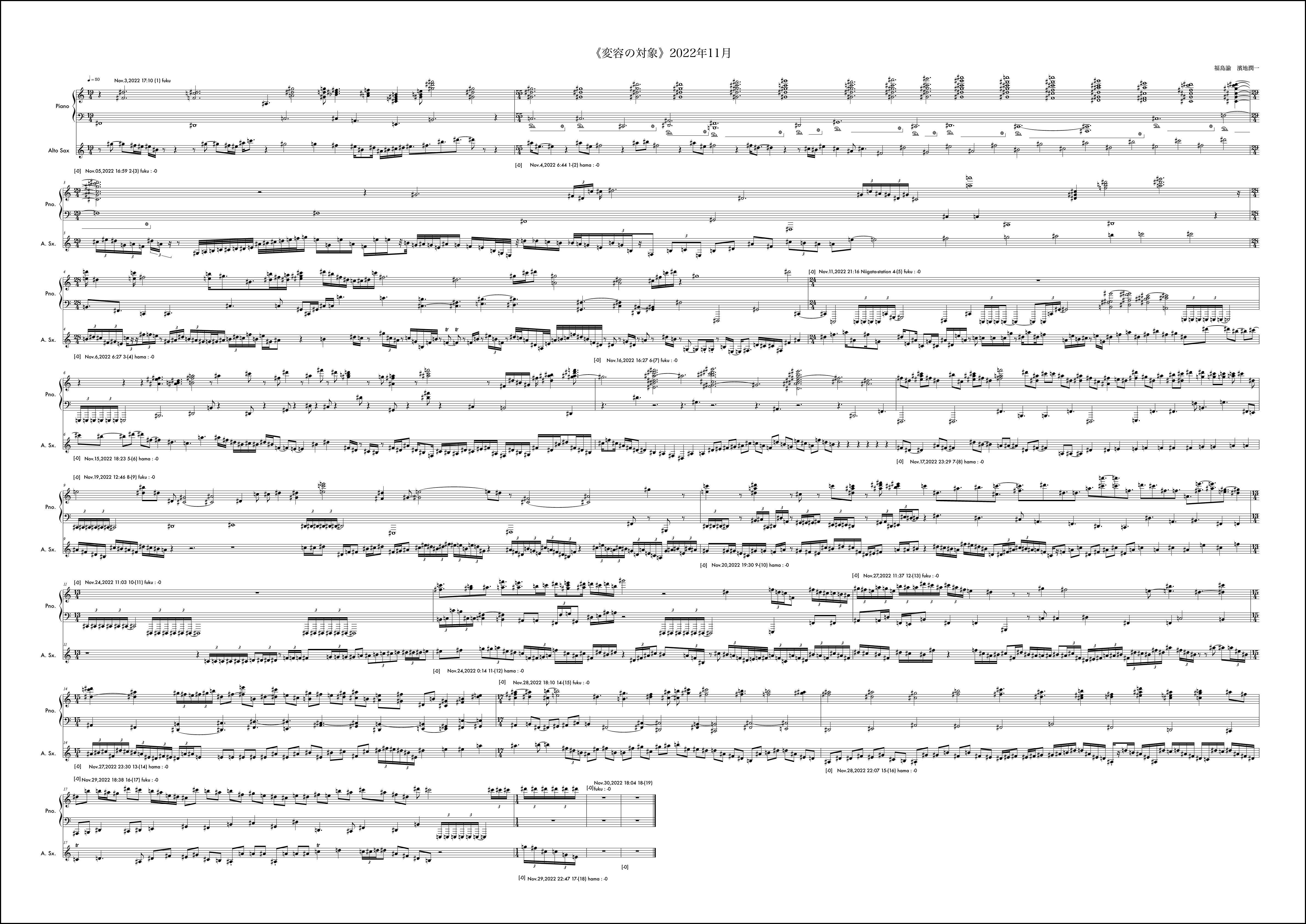 毎月の《変容の対象》の作曲に並行しながら、岐阜県美術館での展示期間に合わせたもう一つの《変容の対象》を例外的に行なっていた。7月5日から開始されるが、7月は通常の《変容の対象》で福島から開始されていたこともあり、ここでは濱地が第1小節目を受け持っている。冒頭の1小節目から明確なテーマが提示されている。このテーマは結局楽曲全体を通じてピアノにも浸透し、サクソフォンにも何度も回帰されるものとなった。そのような意思が感じられるのは3小節目のサクソフォンに早くも冒頭のテーマがリフレインされることにも顕著である。福島がそれを受け取りその後の展開にこのテーマの断片を幾度も練り込もうと試みるきっかけにもなった。基本姿勢はそれだとしても、場面は様々に変化していく。急激な変化が感じられるところはおおよそ6箇所と見ていいだろう。具体的には11小節目、13小節目、15小節目、18小節目、25小節目、そして30小節目だ。11小節目は10小節目までに高まった楽想がここで一つの区切りを迎え、次の場所を探すように移行に向かう。サクソフォンに大きな動きは見られない。13小節目でピアノがこれまでの響きから別の場面に断絶する。しかしここではもともとサクソフォンのテーマの変形がみられるため、全体の印象としてはサクソフォンがテーマへの再起を促すように感じられるかもしれない。15小節目ではピアノソロになり移行的な展開となる。18小節目ではピアノは素朴な展開に変化する。サクソフォンとの調和も静かに、対話的に整っている場面だと思う。25小節目で、9月に入った。展示期間も終盤という思いが作用していたかはわからないが、サクソフォンの流れに目を覚ますような、細かな密度の音が散りばめられる。ピアノはここで大きな低音で答えている。ここでのアプローチは通常の1ヶ月の《変容の対象》では出てこなかった要素だと感じていた。長い期間でいくつかの場面展開を経て到達する新しい様相なのかもしれない、と作曲時に考えていた。30小節目からは楽曲を締めくくる場面になるが、ピアノは最後の2つの和音を置くか、1つにしておくべきか、判断を任される形になった。最終日であったし、濱地さんのアプローチは31小節目を無音にすることで余韻を残し終わることを想定していたのかもしれない。音楽的にはその美しさもあると考えながら、今回の《変容の対象》が期間を特殊な形に設定した例外的なものであったことを考えて、最後に和音を付け加えてしまったのだと思う。全体の音楽的な内容からすれば蛇足に思える観念的な終止だったのかもしれない。